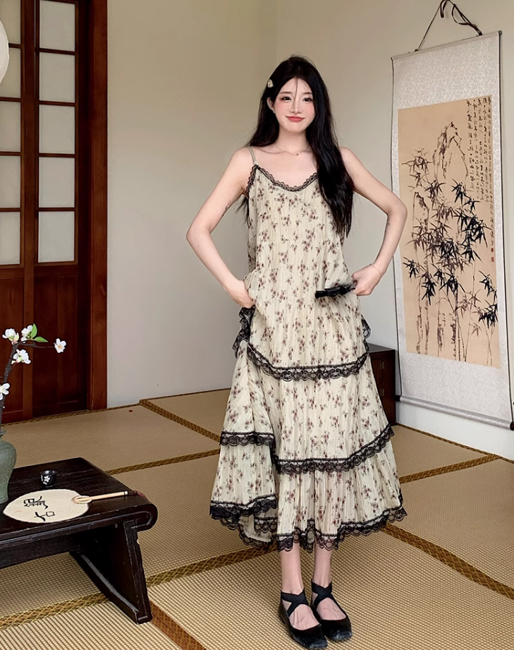 Fairy floral sling cake skirt retro college style v-neck tea break French niche design dress R1733
