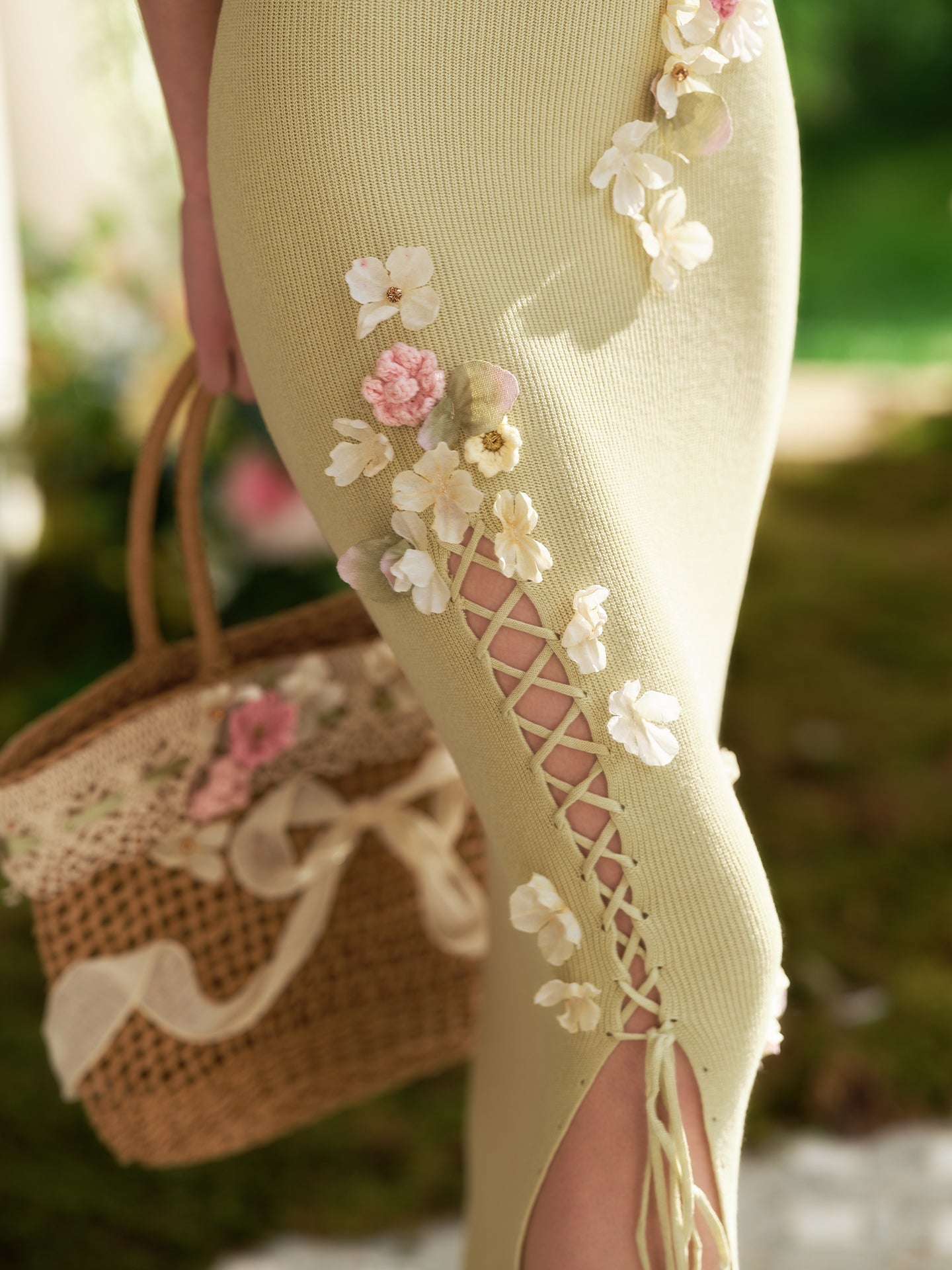 French heavy design flower wool knitted suspenders green slit dress R5112