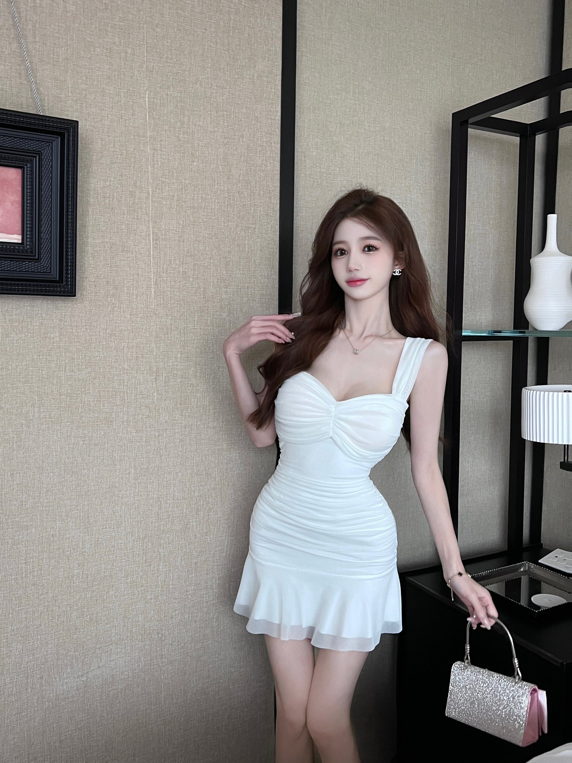 French pure desire style sexy mesh dress ruffled slim fit hip-hugging short skirt vest skirt R3630