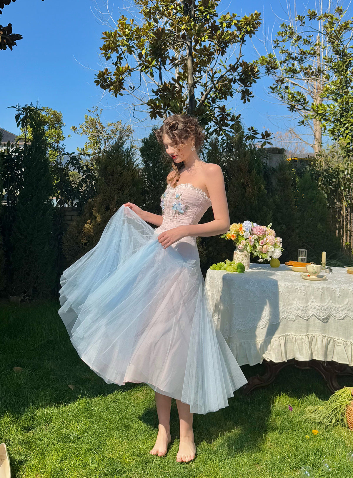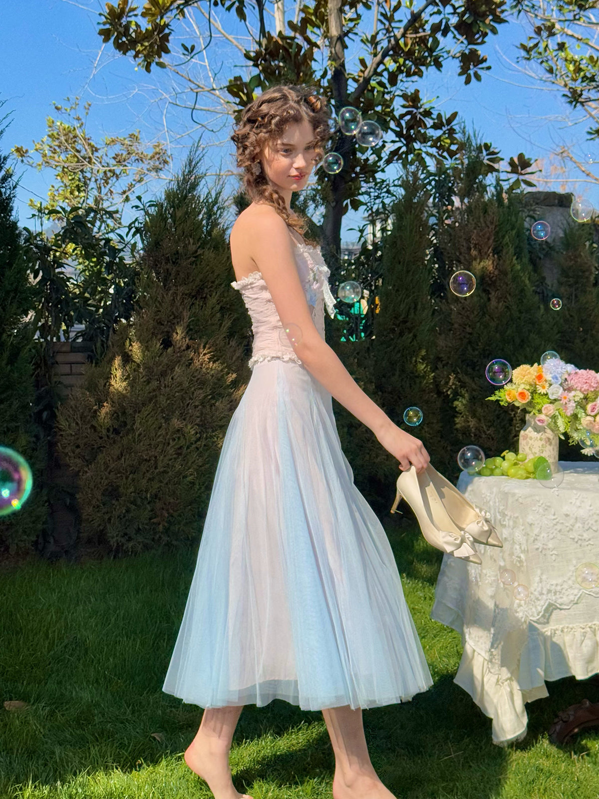 French sweet light spring pink blue tube top fishbone bra mesh skirt suit homecoming dress R5146