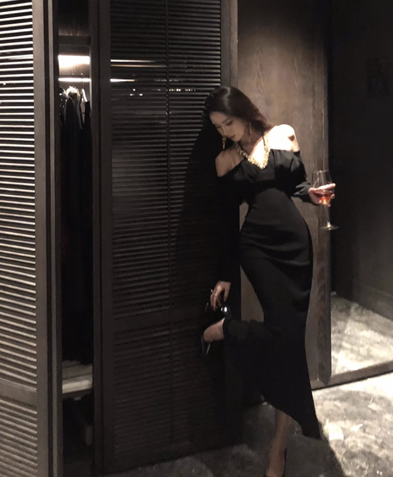 Hepburn style French dress high-end niche temperament sexy off-shoulder black dress R1781