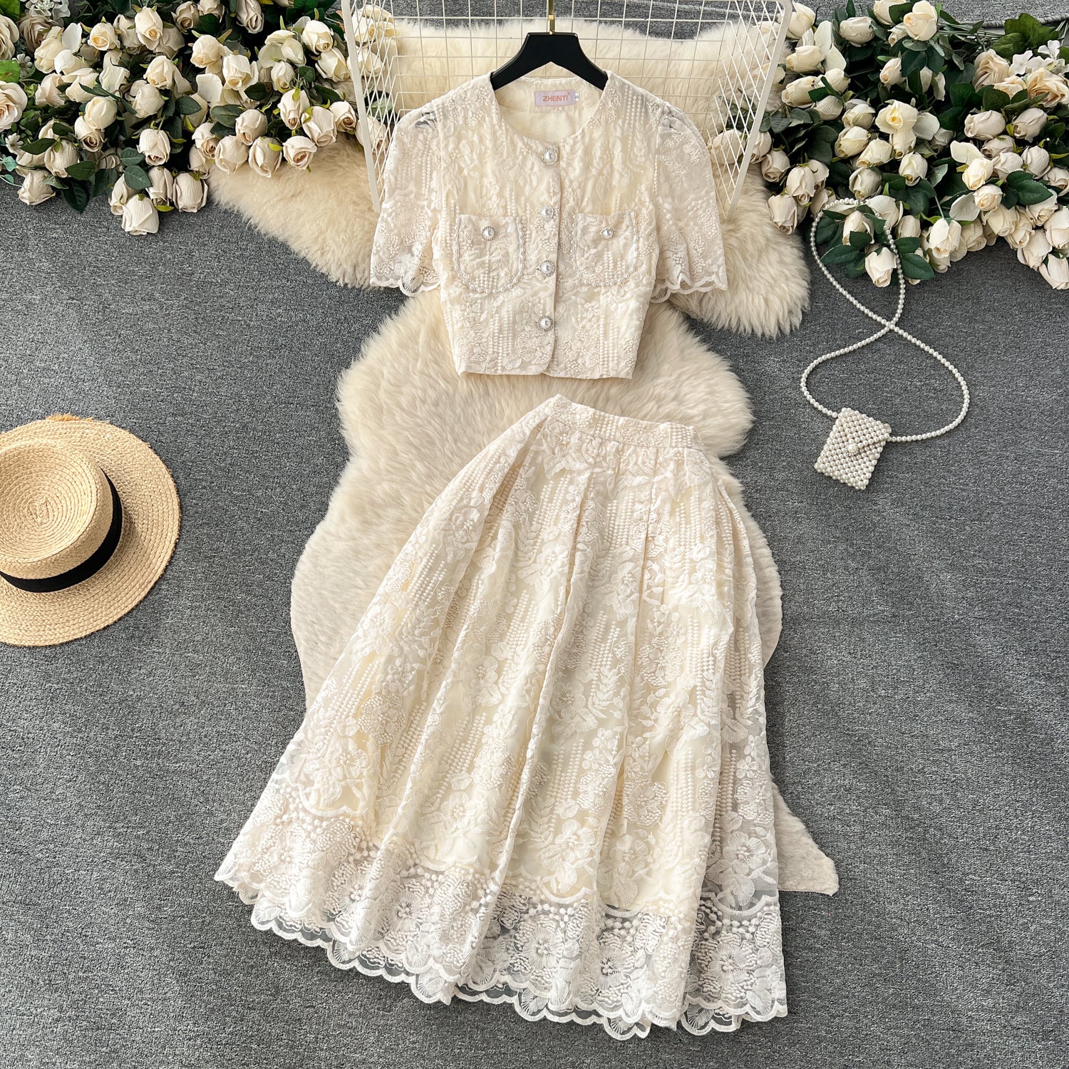 High-end suit French lace hook flower puff sleeve shirt two-piece high waist slim skirt R2137