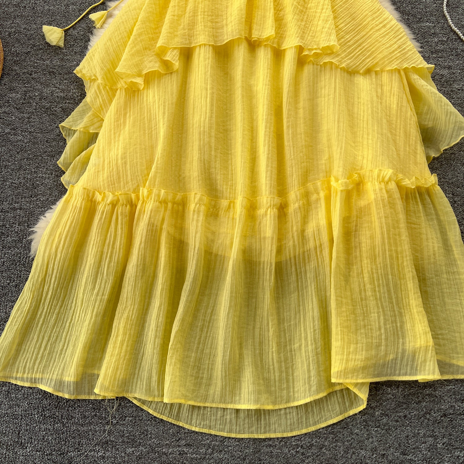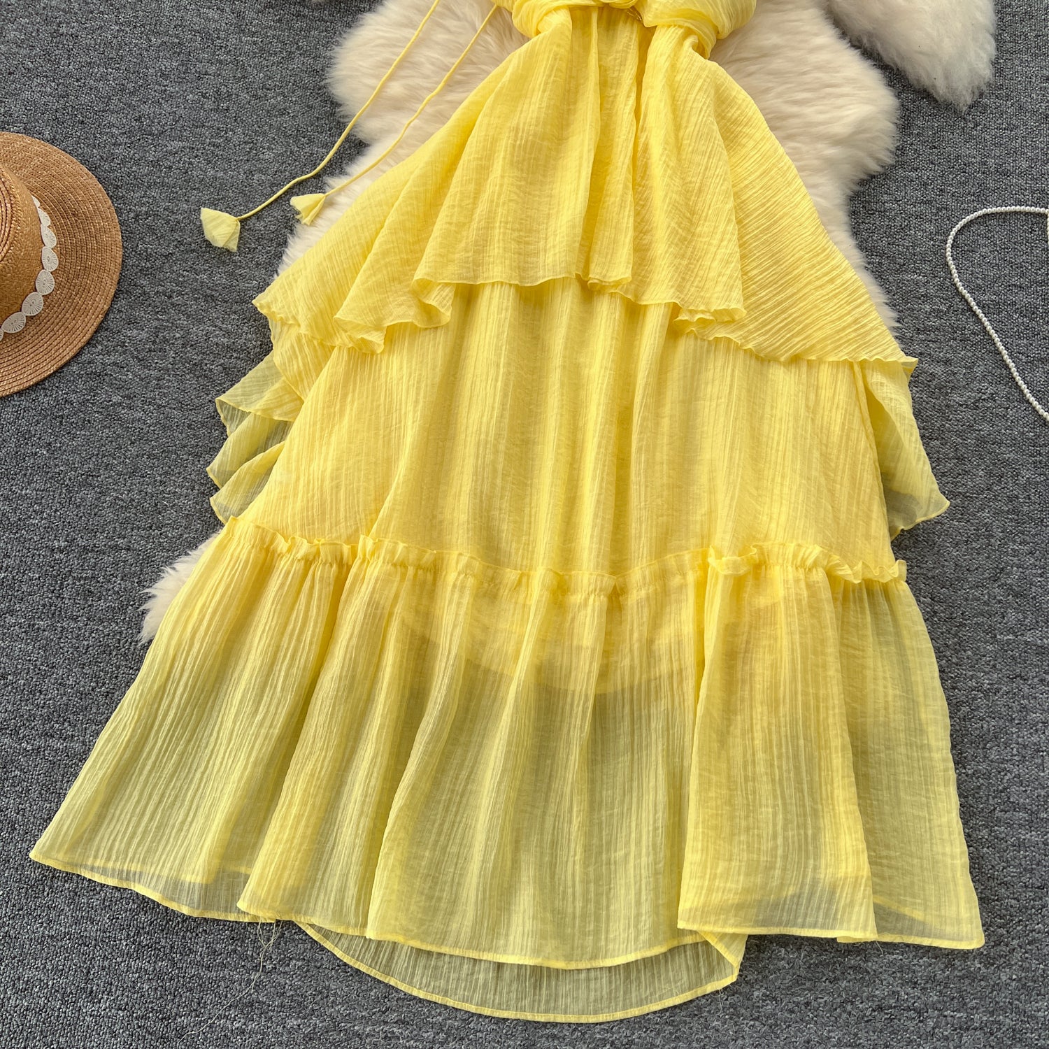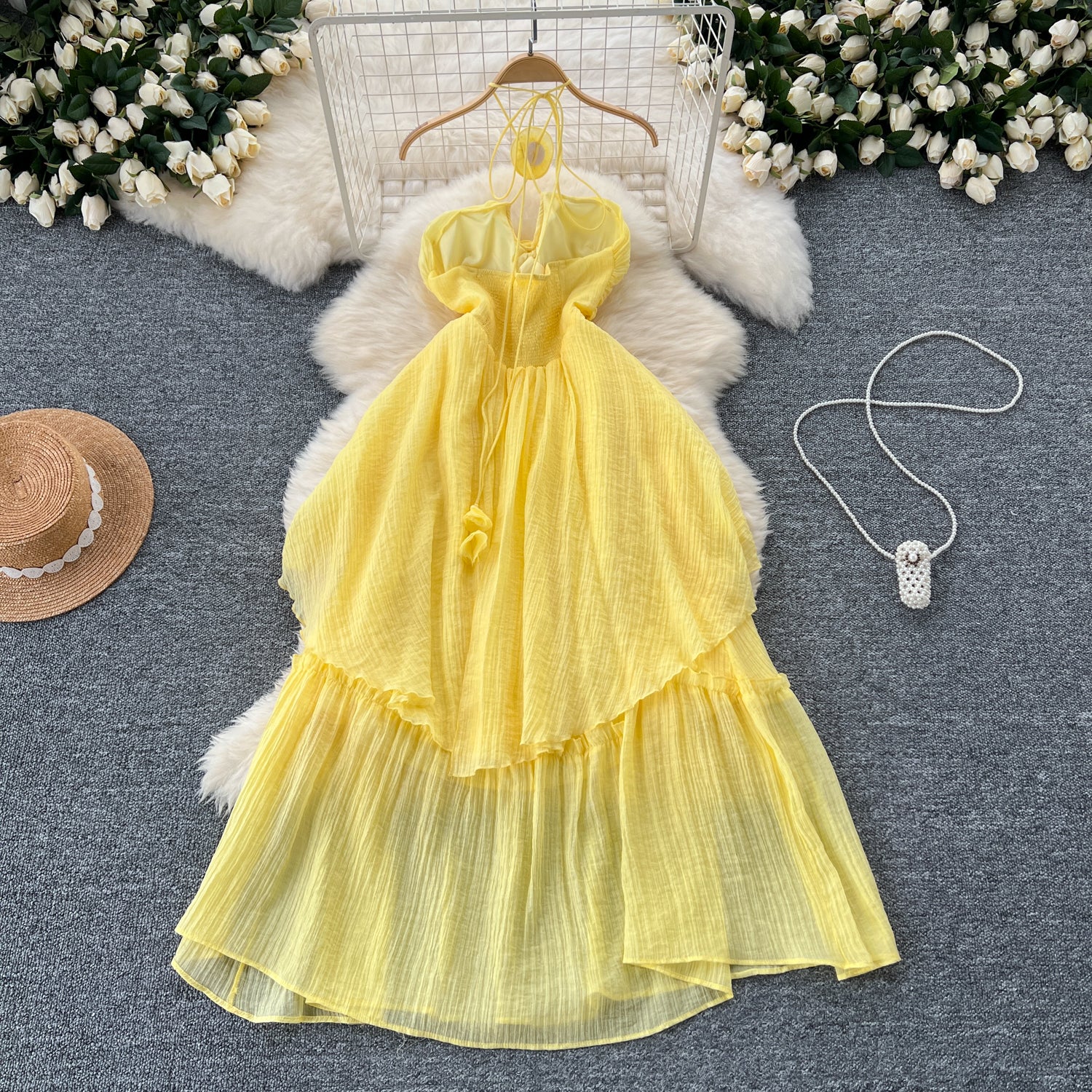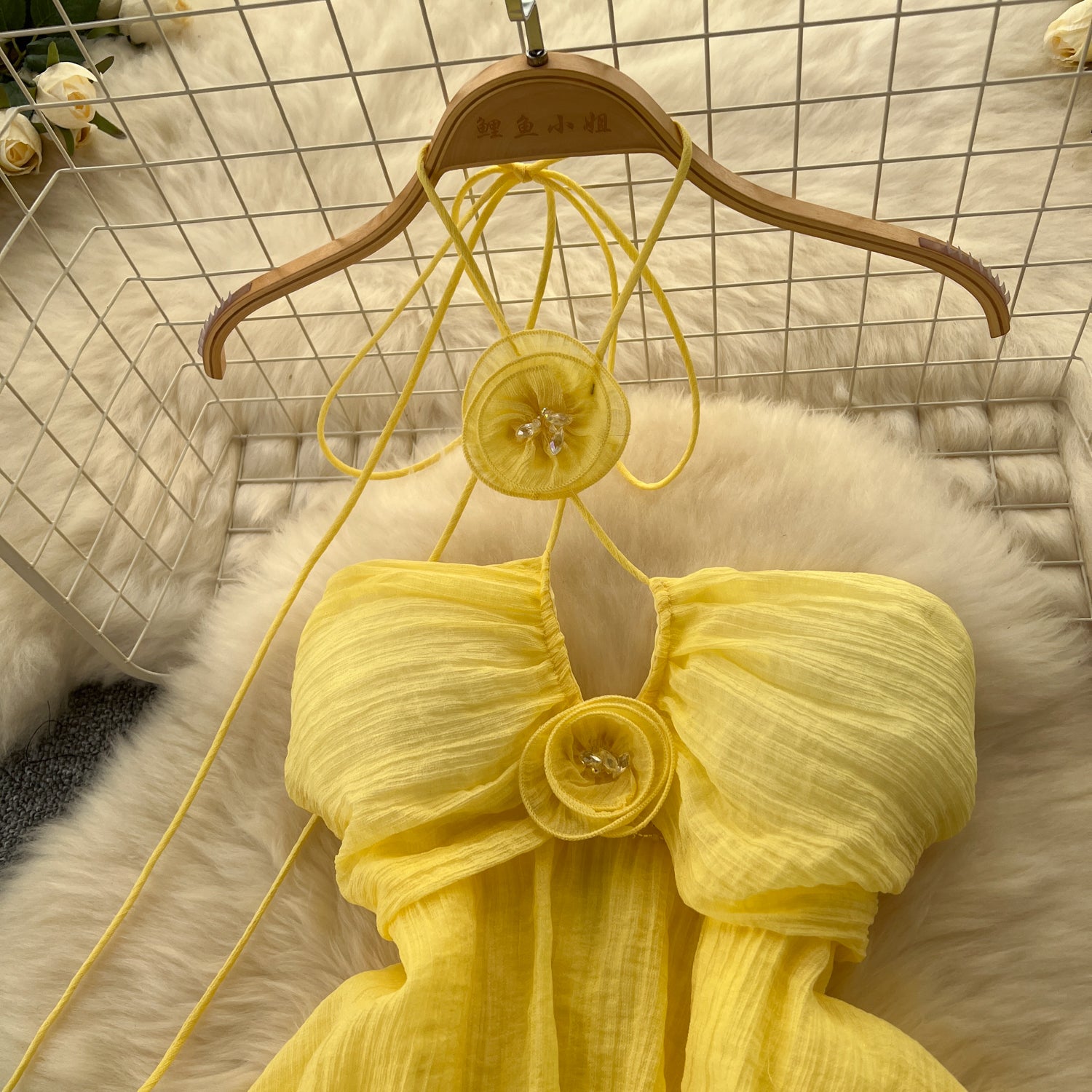 Holiday dress hollow chest-revealing halter neck suspender three-dimensional flower long dress R2336