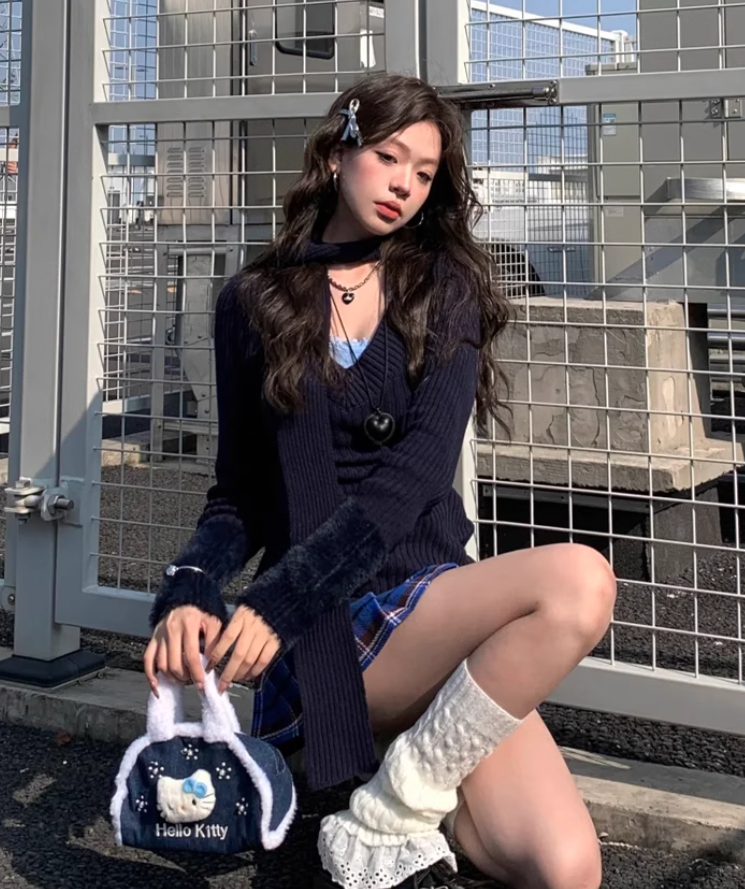 Large size American high street V-neck sweater bottoming sling retro plaid skirt suit R1857