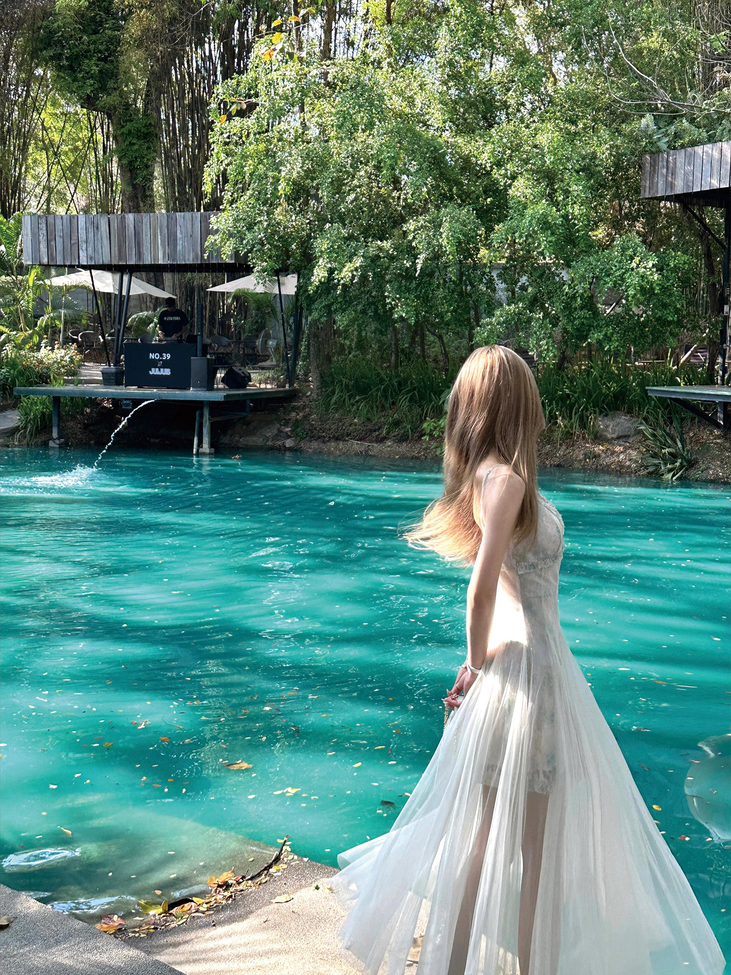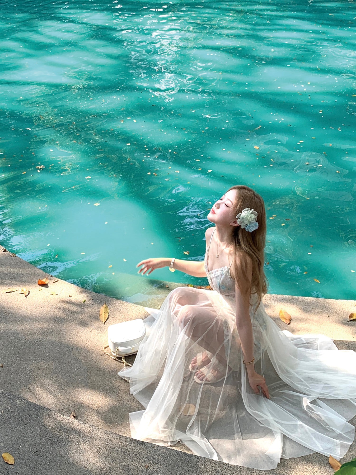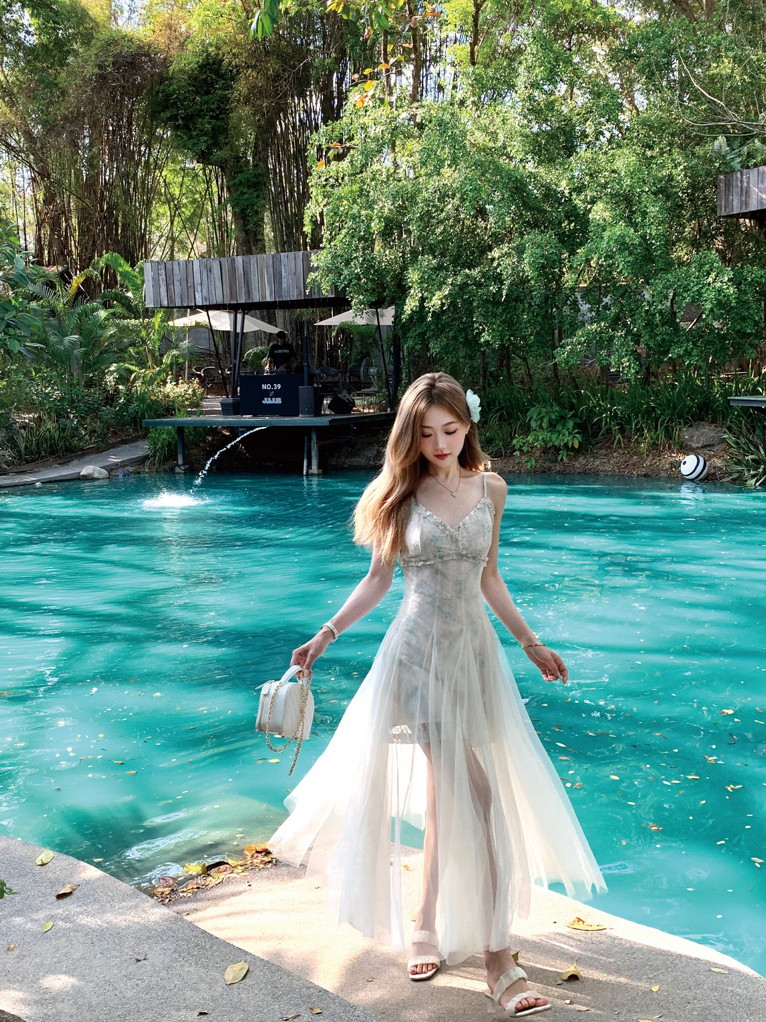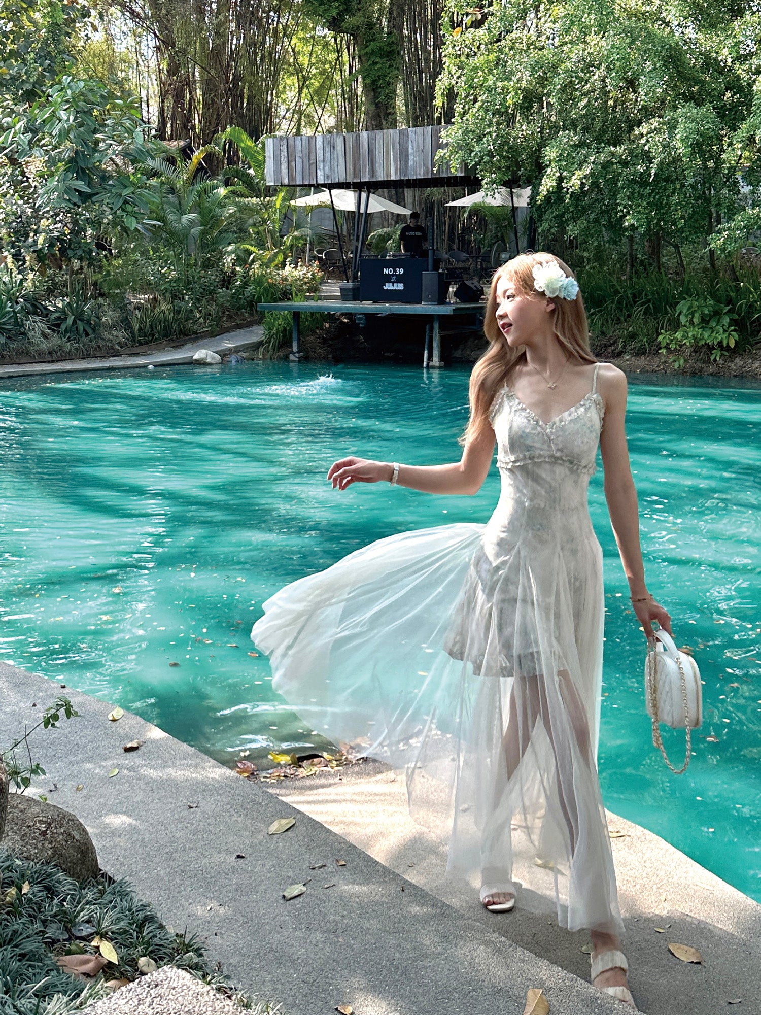 Mint green mesh dress fairy holiday lace summer suspender long dress new style R3873