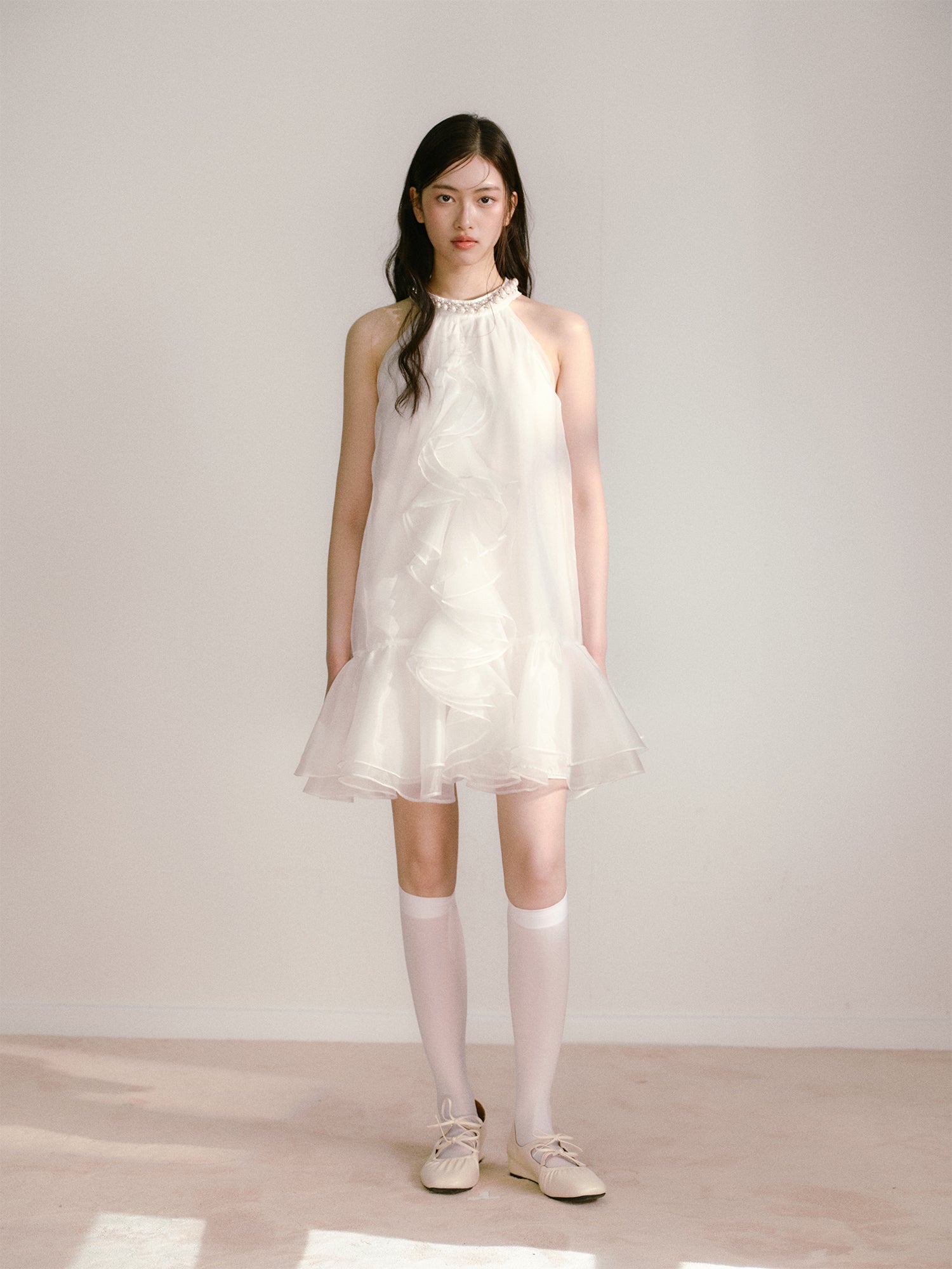 Moonlight White Layered Organza Tie-Up Bow Pearl Neck Tutu Dress R5126