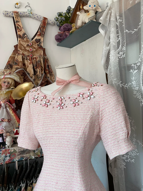Pink short-sleeved fitted A-line mini skirt, prom dress R6334