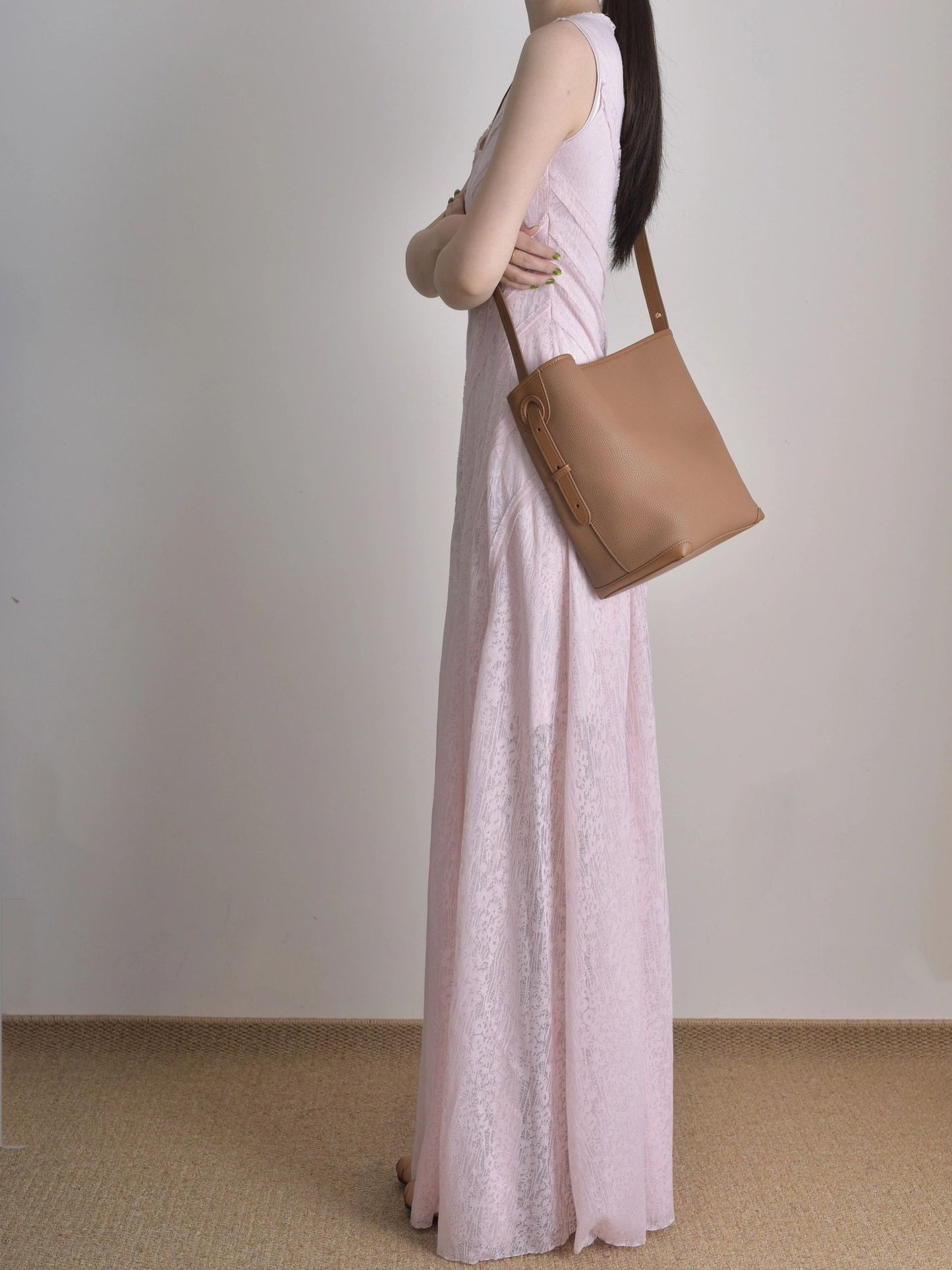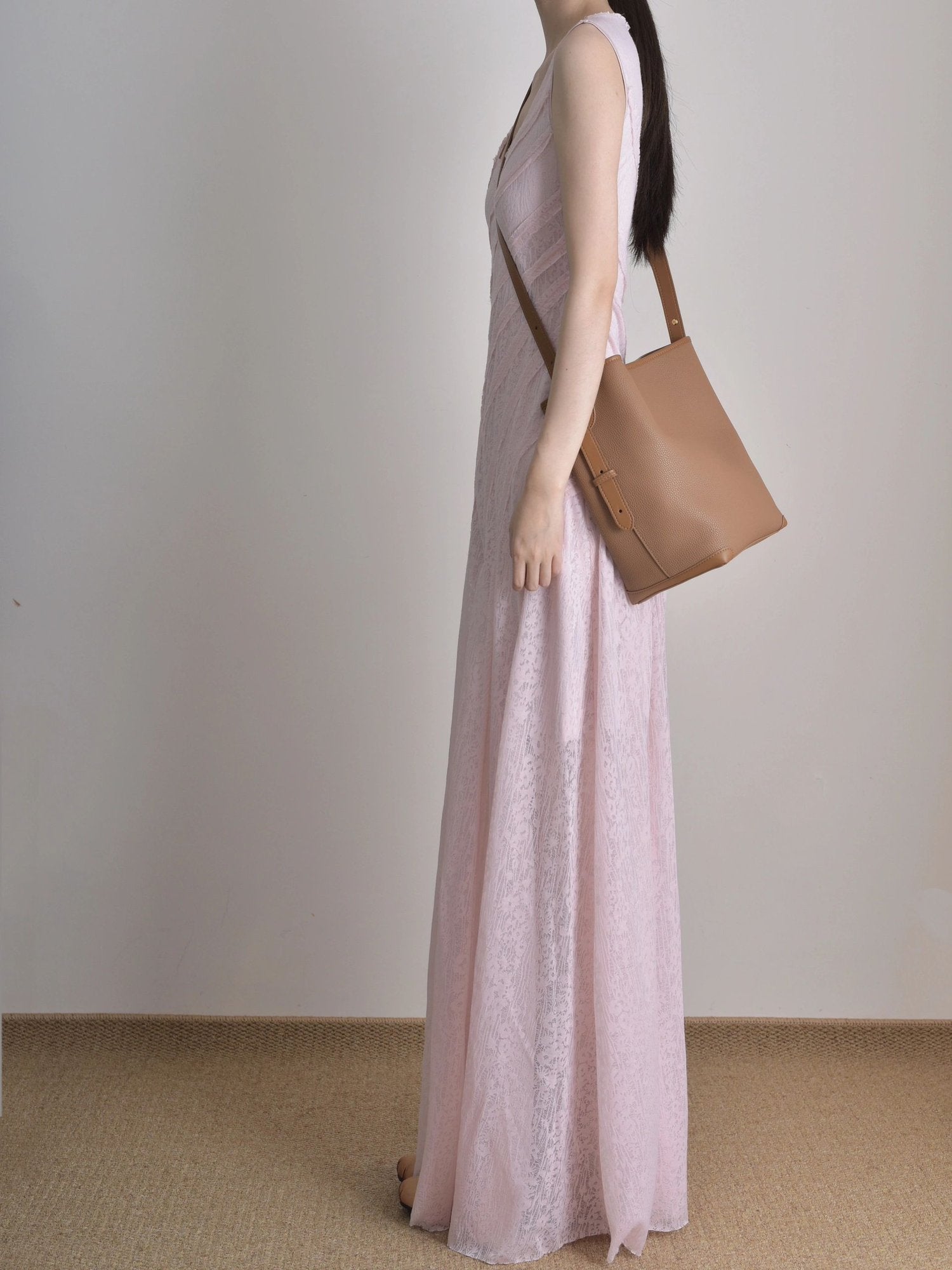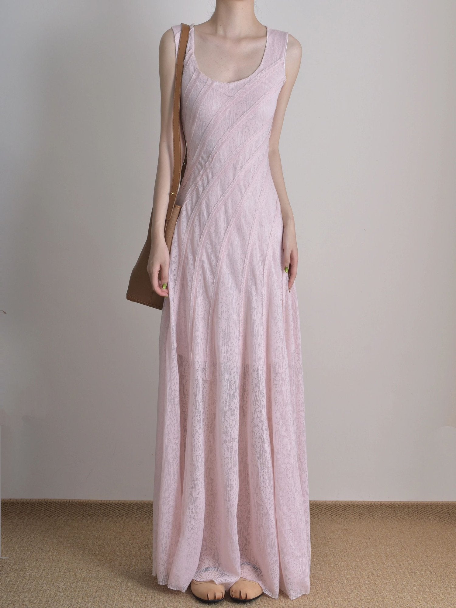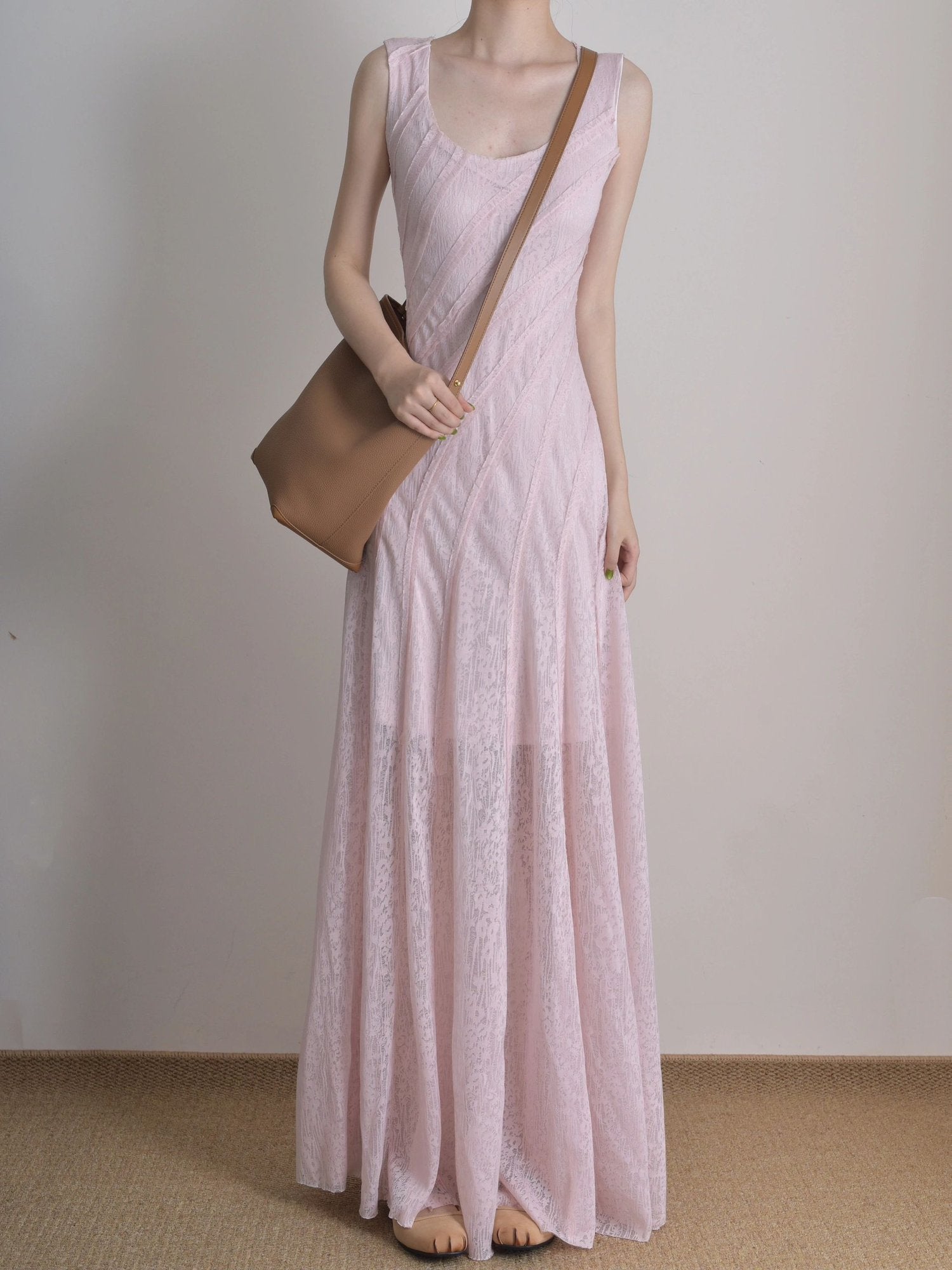 Pink suspender dress, beautiful waist temperament long dress R0533