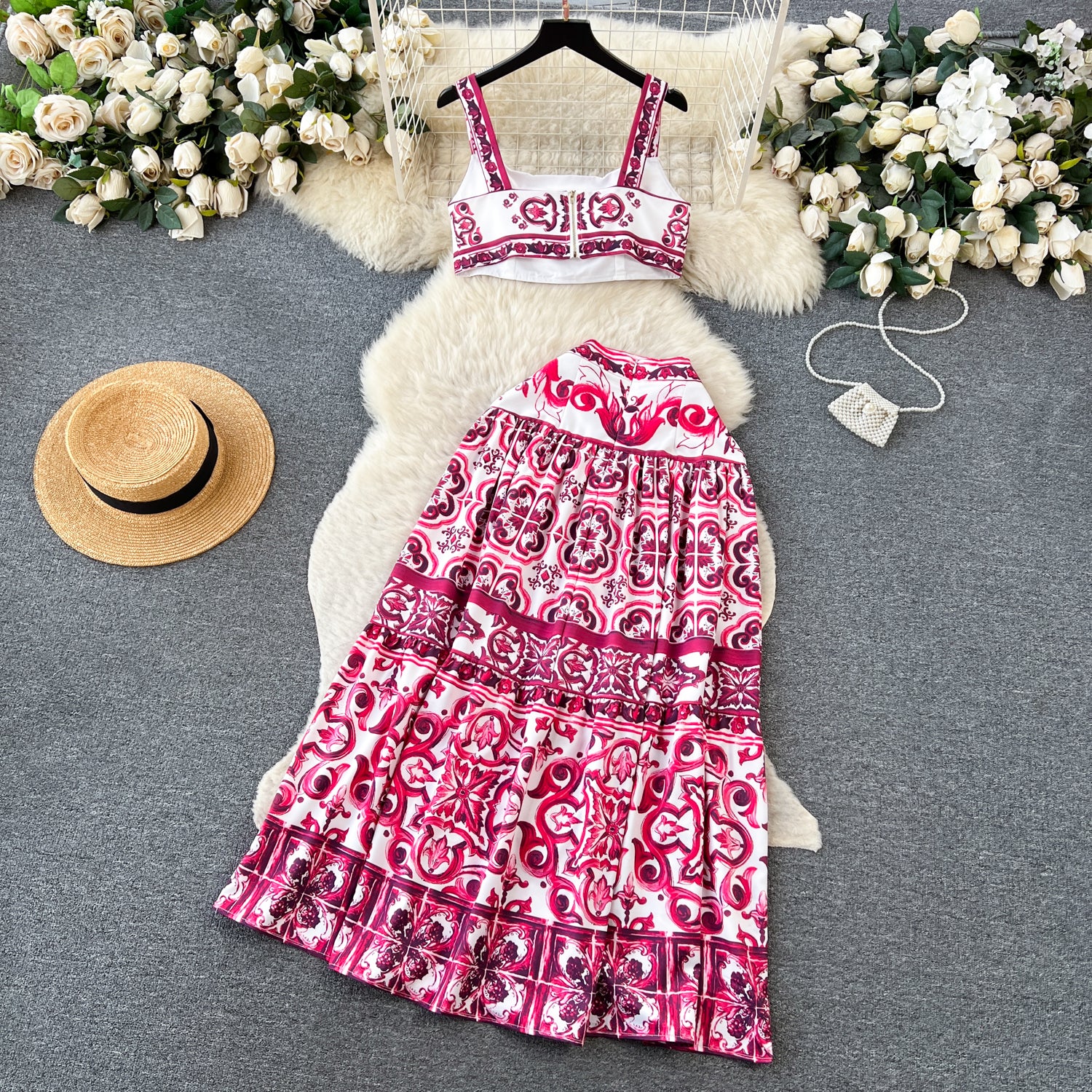 Printed suit pure waist-revealing camisole vest high waist midi skirt R2138