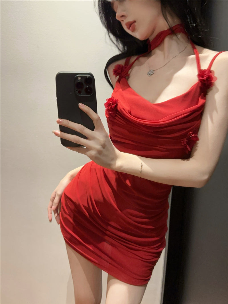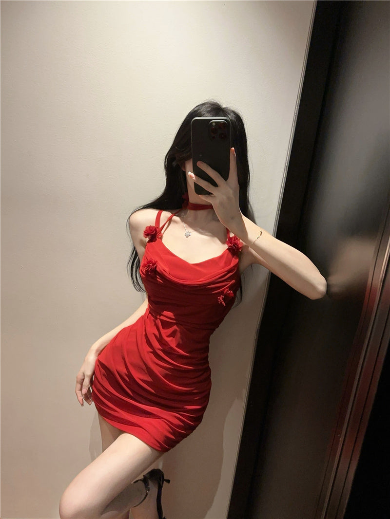 Pure and gentle style flower sling dress with tassels, slim fit, pleated, slimming, hip-wrapped short skirt R3636
