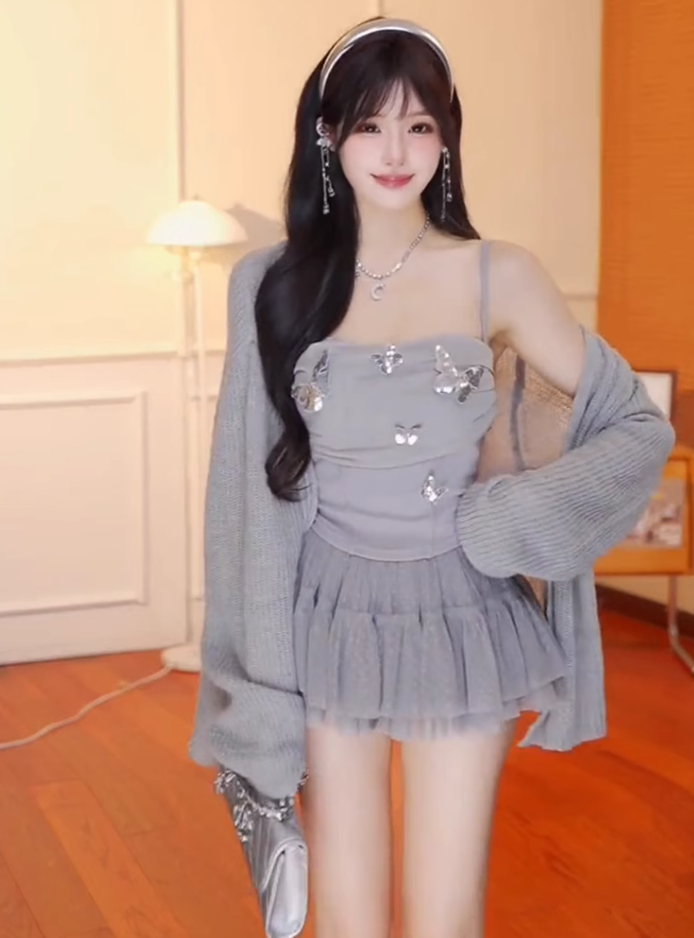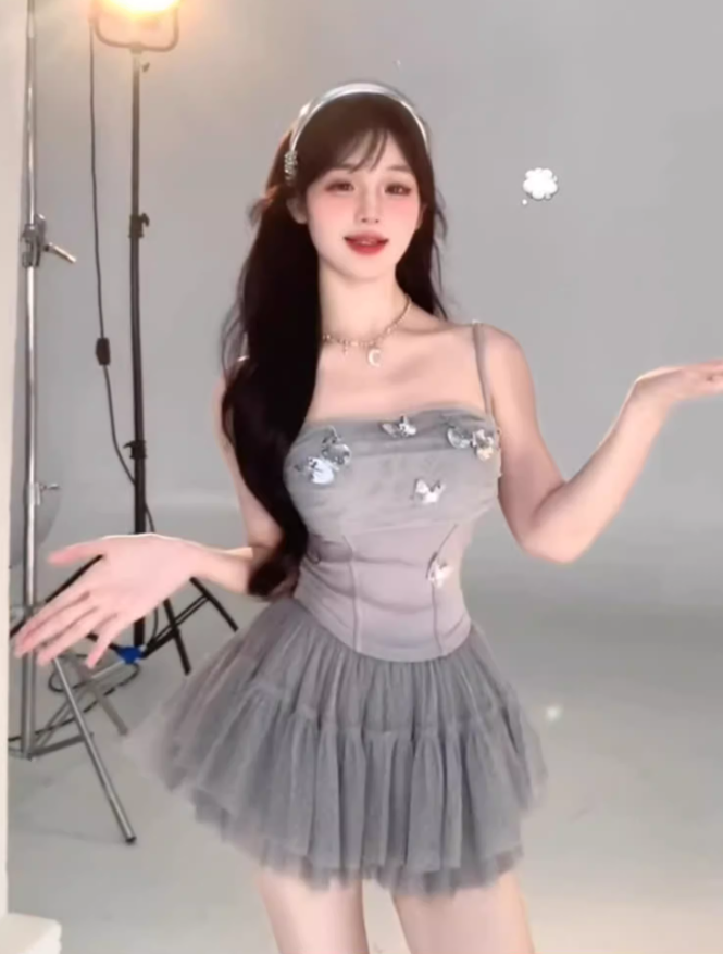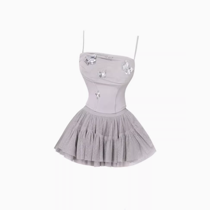 Pure desire style butterfly suspender top 2025 polka dot mesh a-line skirt suit R1141
