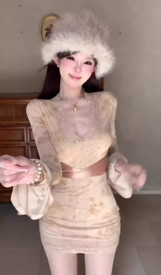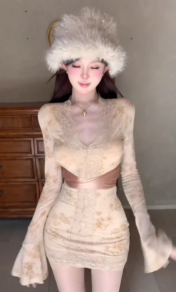 Pure desire style lace splicing V-neck trumpet sleeve dress 2025 waist hip skirt R1010