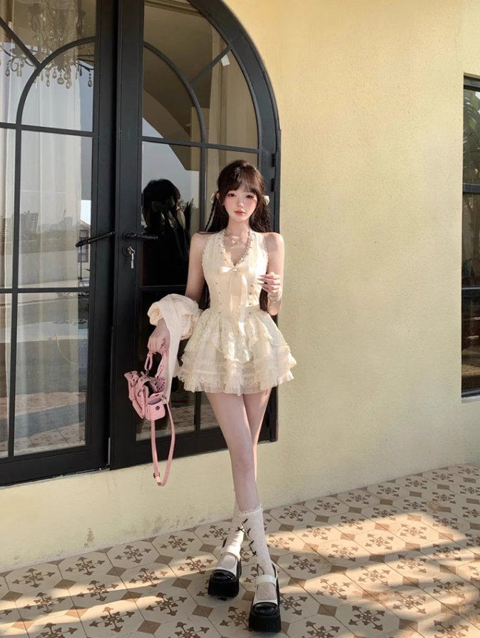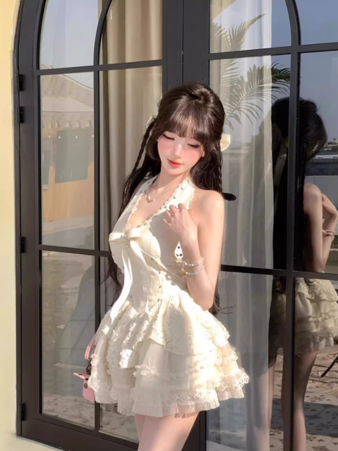 Pure desire style V-neck beaded halter dress 2025 lace waist tutu skirt R1392