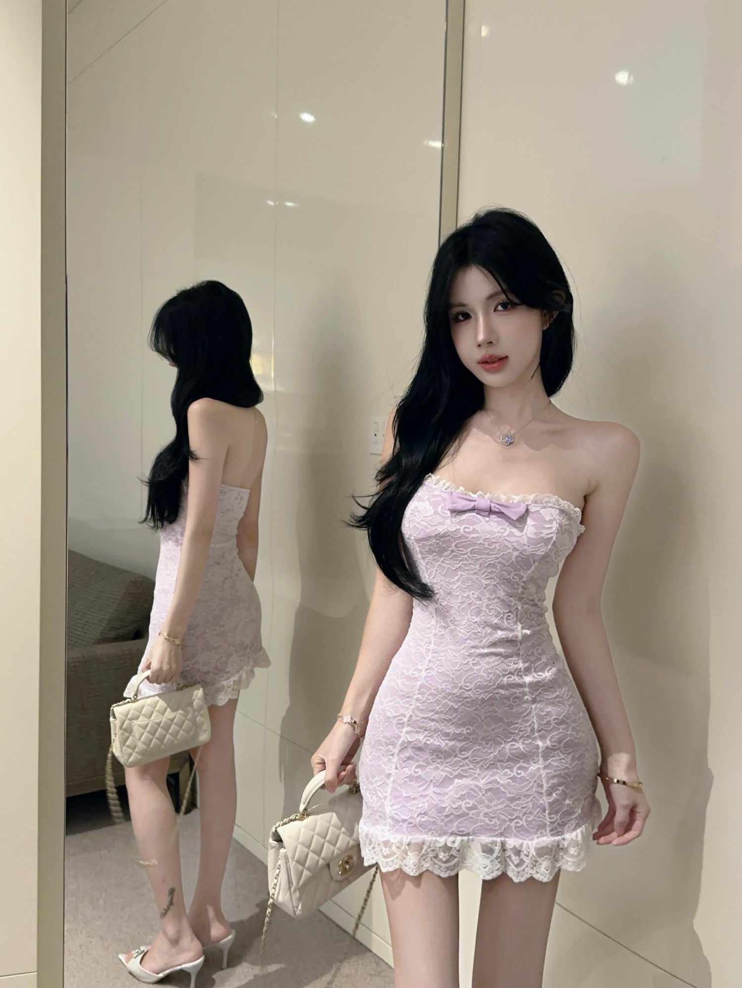 Pure lace tube top dress with bowknot slim fit petite French sexy hip skirt R3668