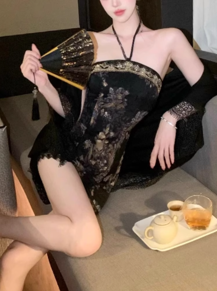 Retro New Chinese Style Floral Halter Neck Dress 2025 Lace Cardigan Set R1390