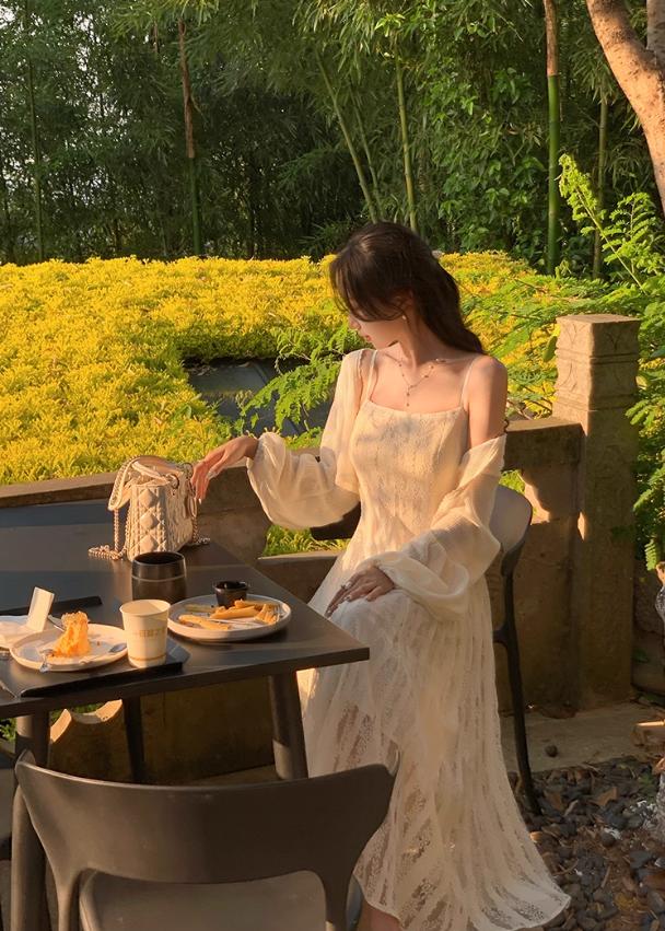 Romantic holiday style suspender dress summer hollow white lace temperament long skirt R4423