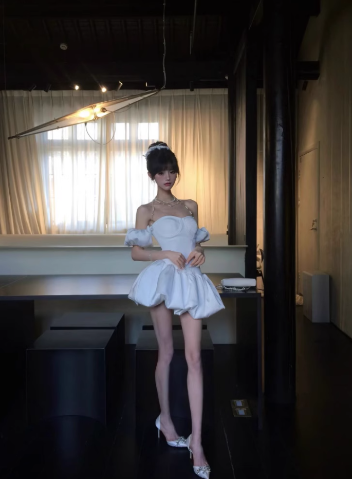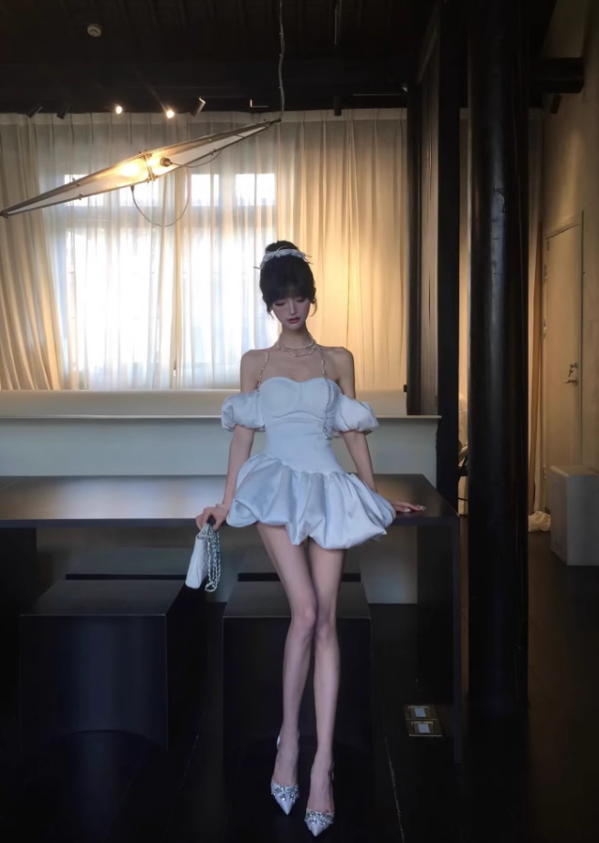 Satin puffy skirt French temperament pure desire style dress retro one shoulder white strapless short skirt homecoming dress R2999