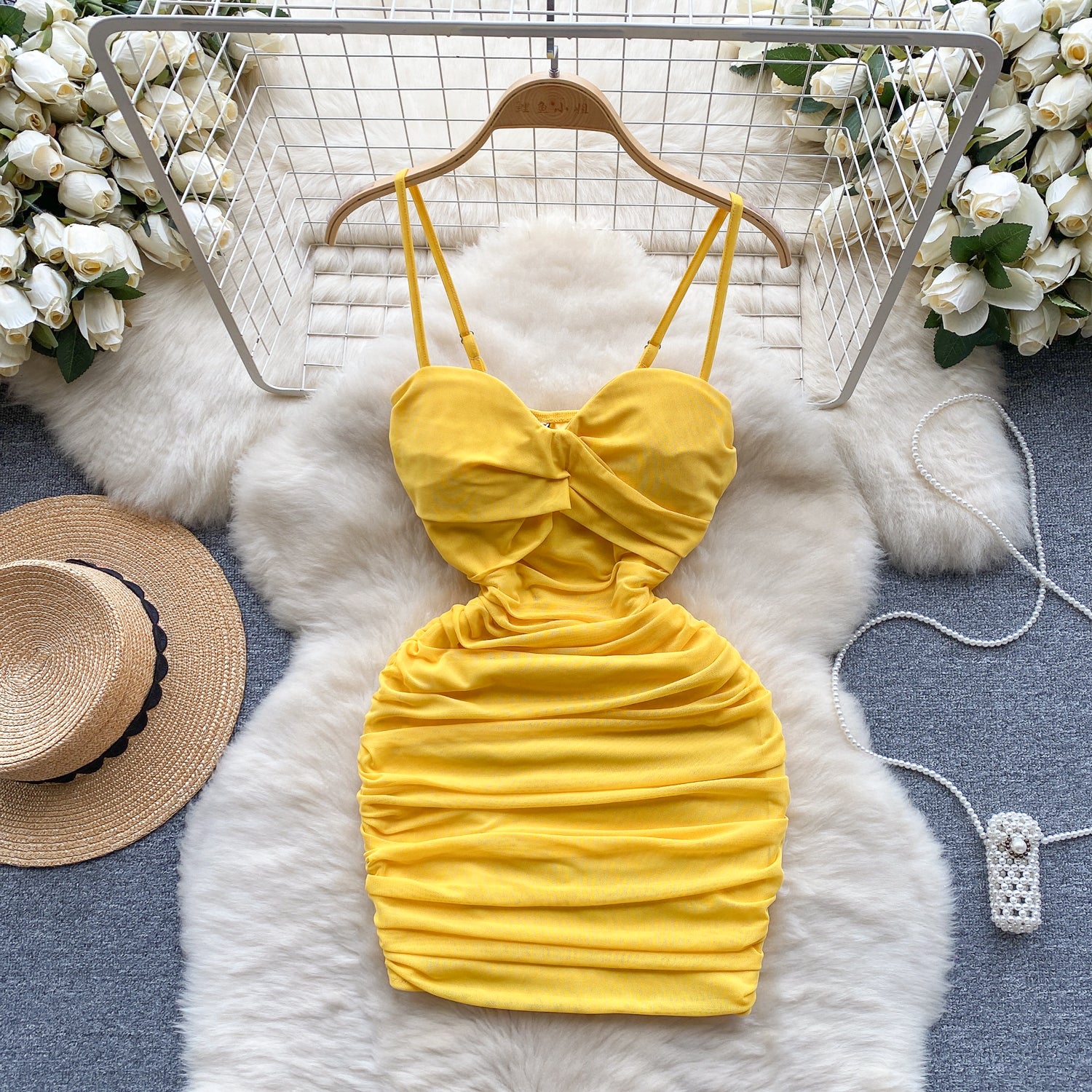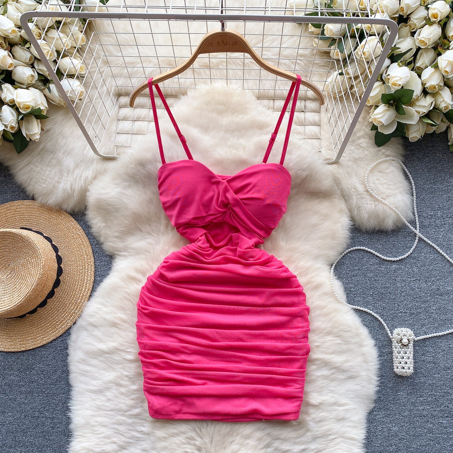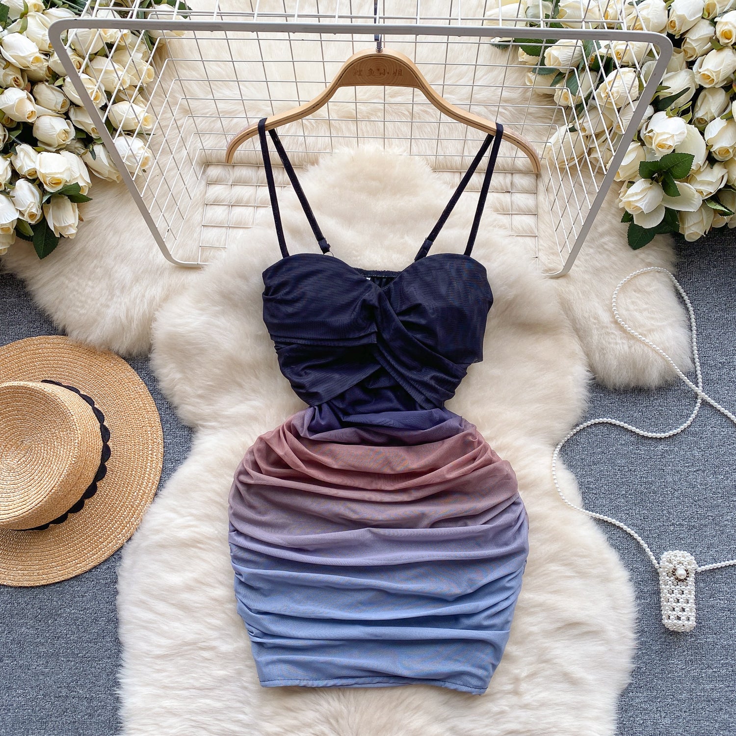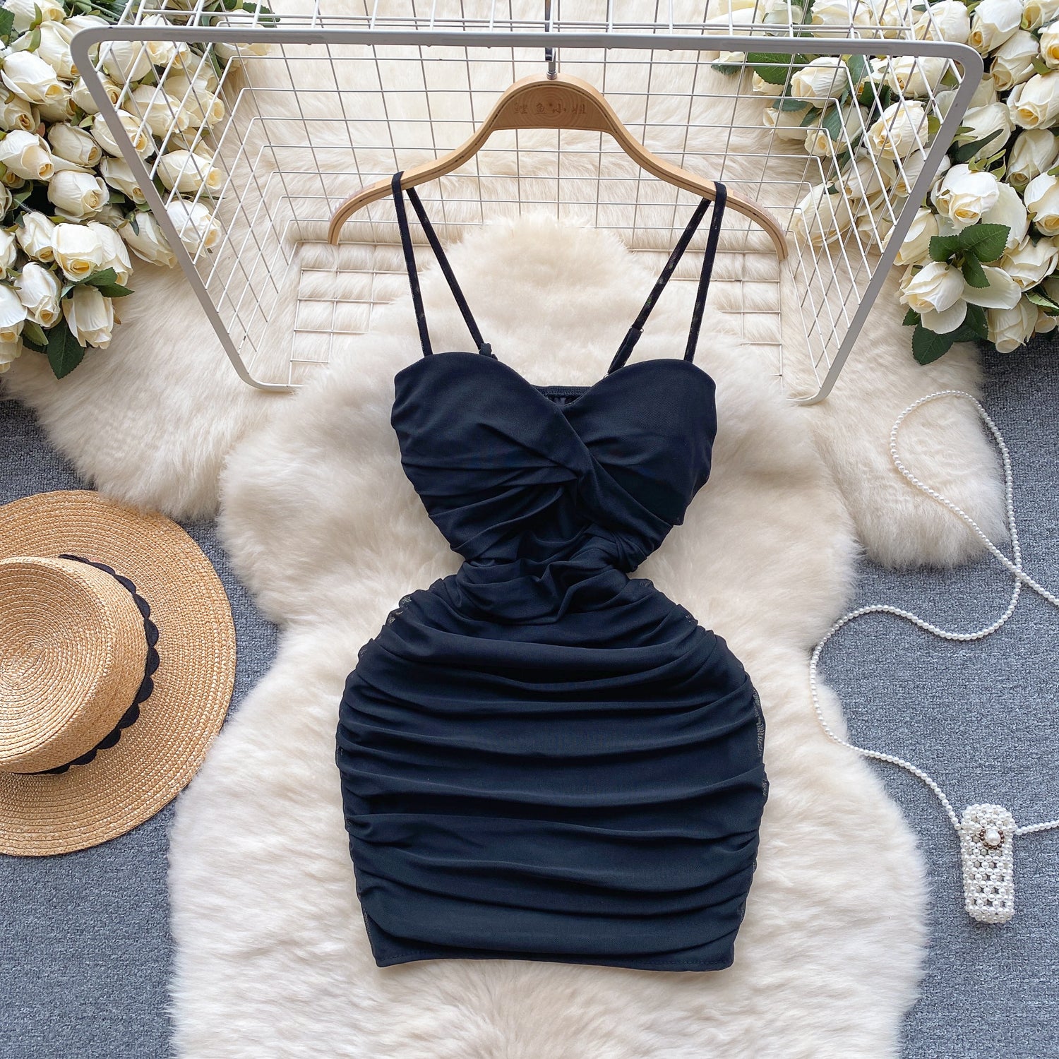 Sexy elastic mesh dress 2025 new pleated slim short sexy hip suspender skirt R2268