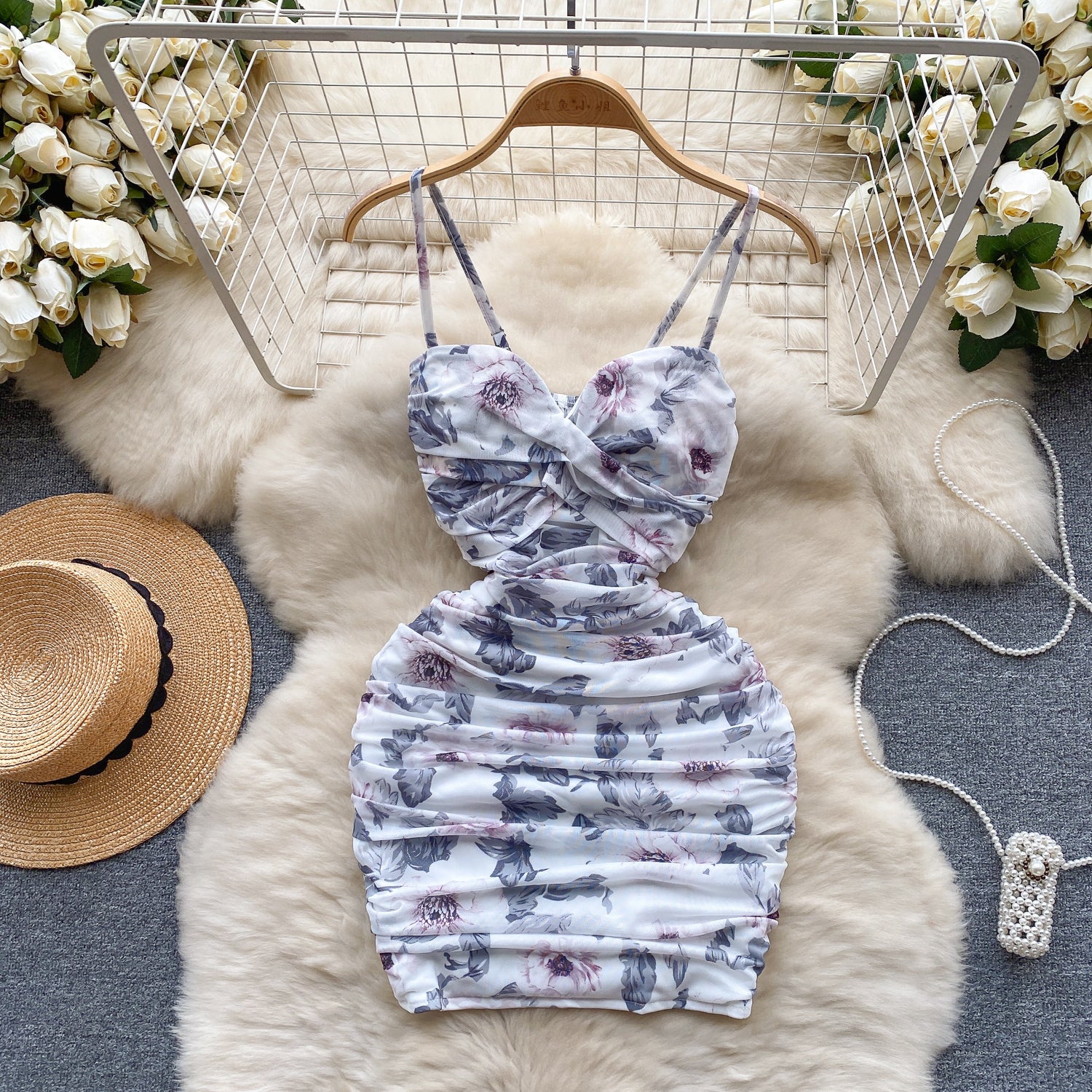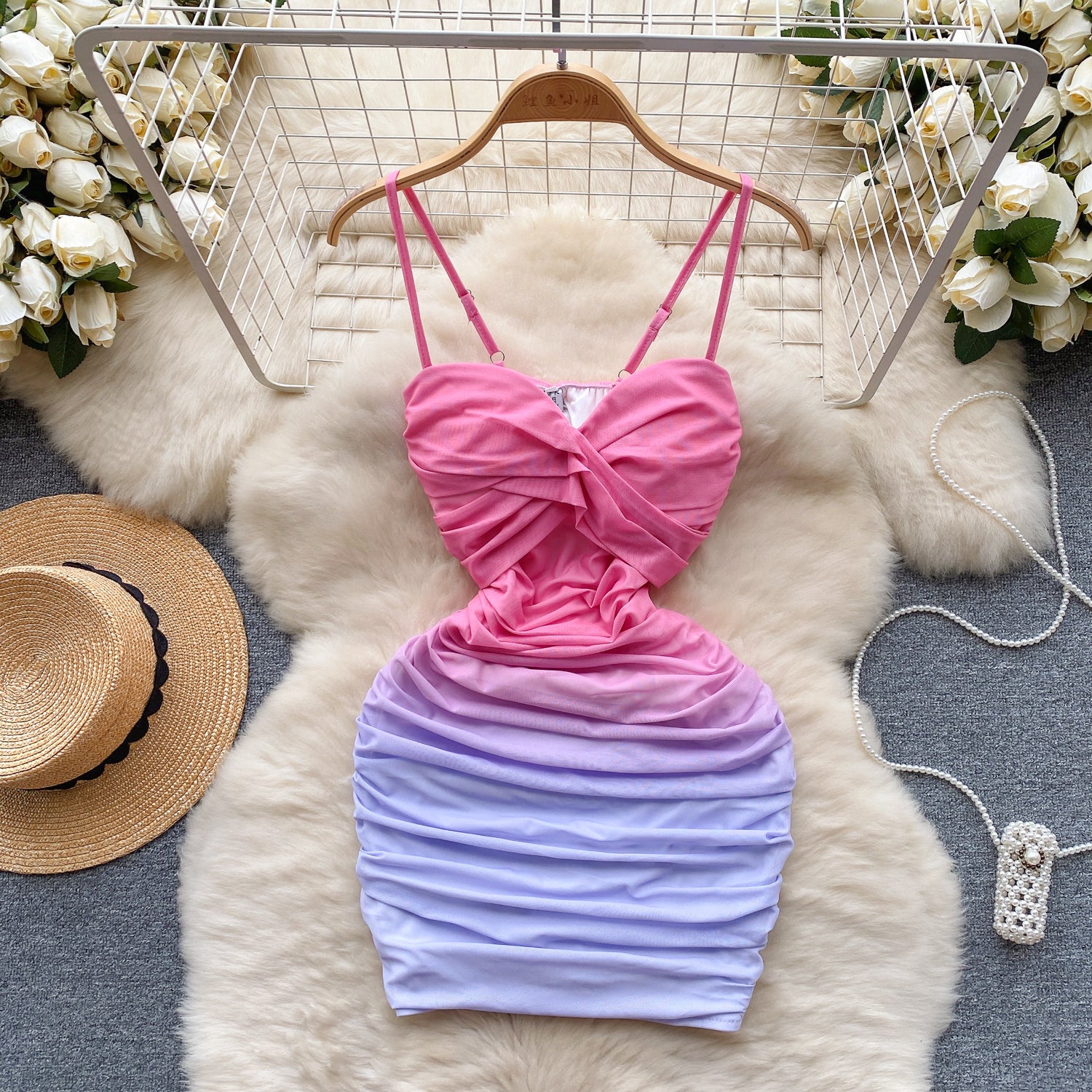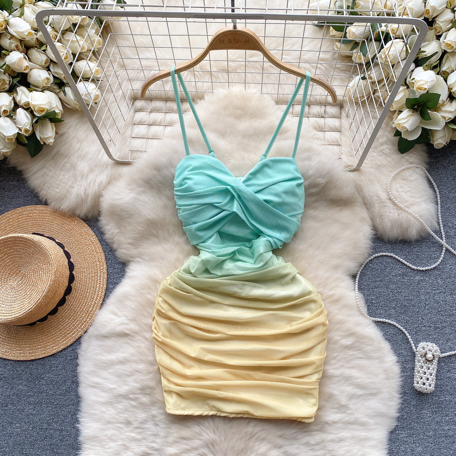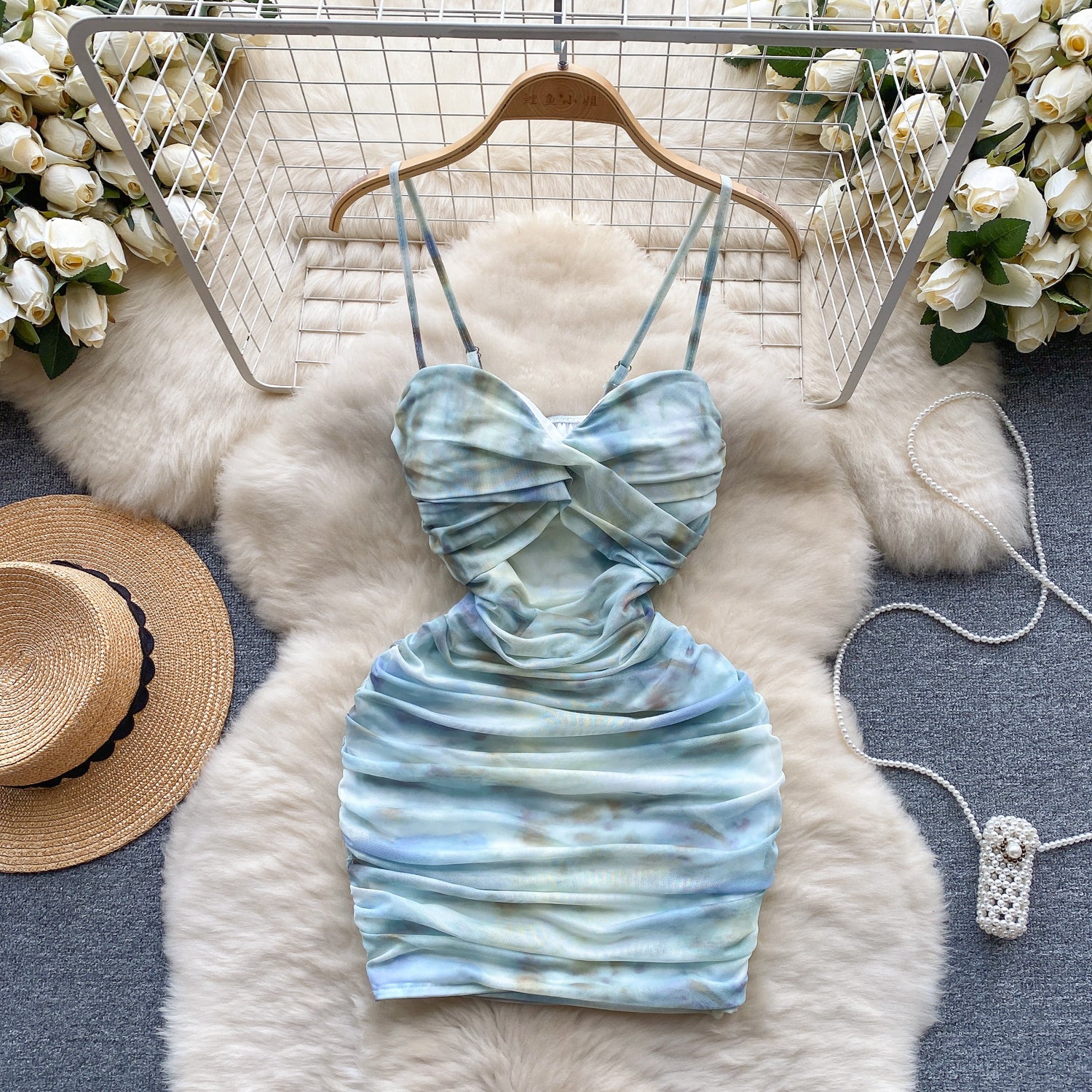 Sexy elastic mesh dress 2025 new pleated slim short sexy hip suspender skirt R2268