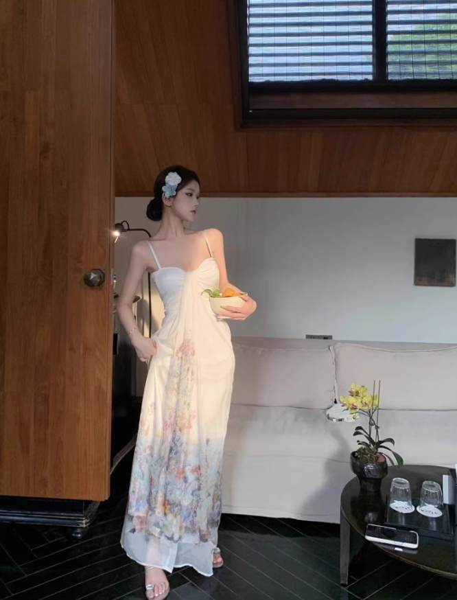 Sexy tube top suspender dress temperament floral long skirt R0542