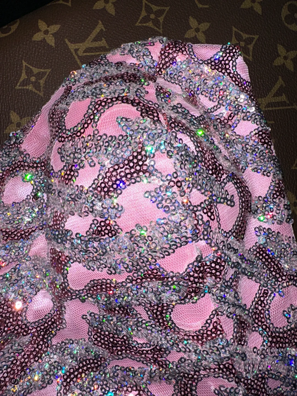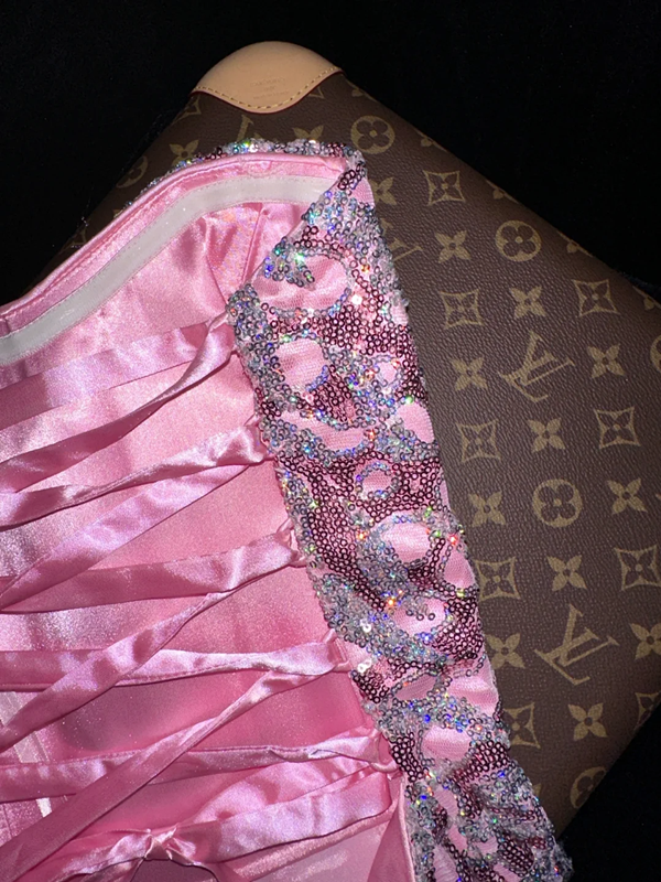 Silver sequined strapless short ball gown with a cinched waist and fitted design R6985