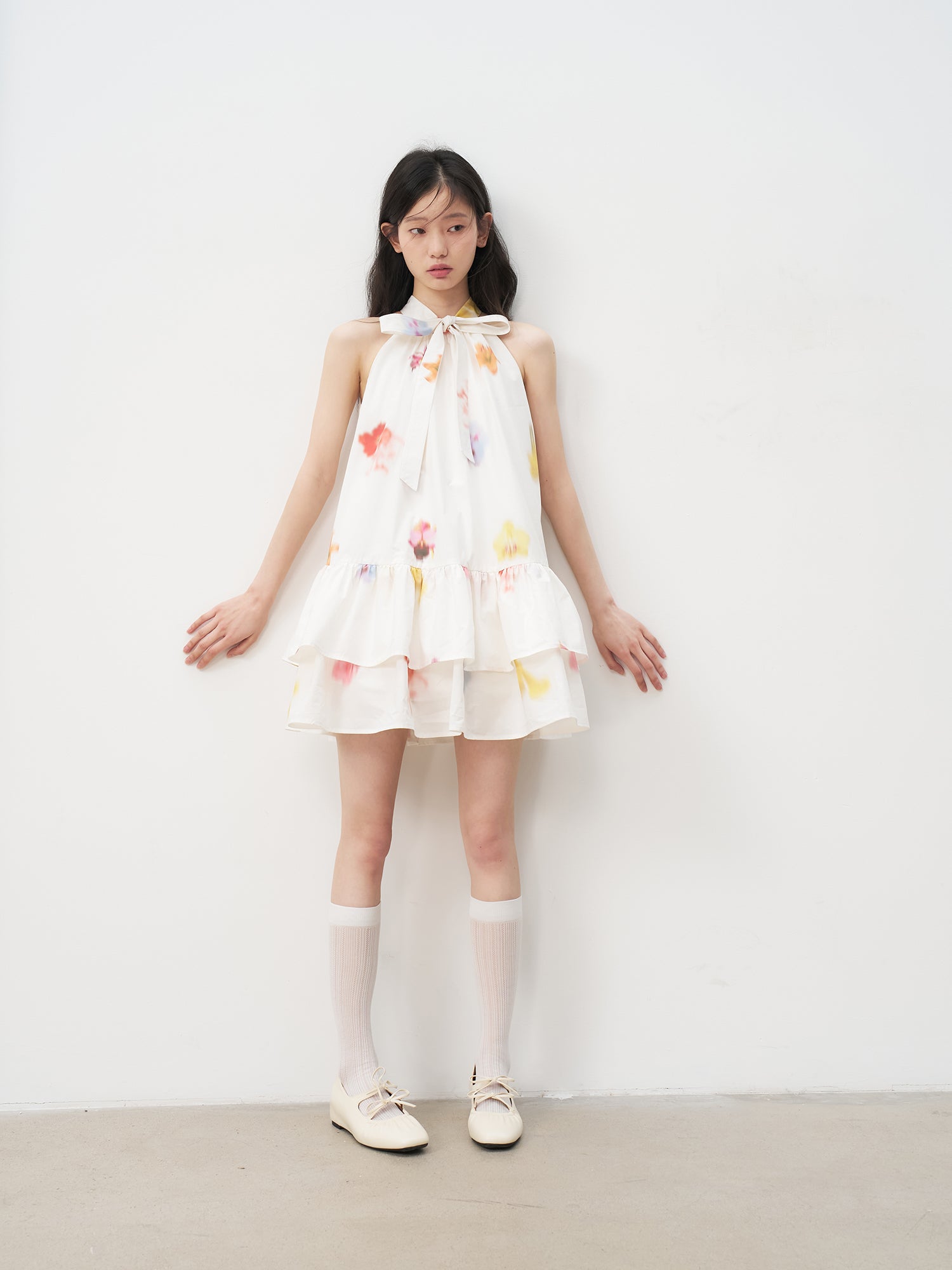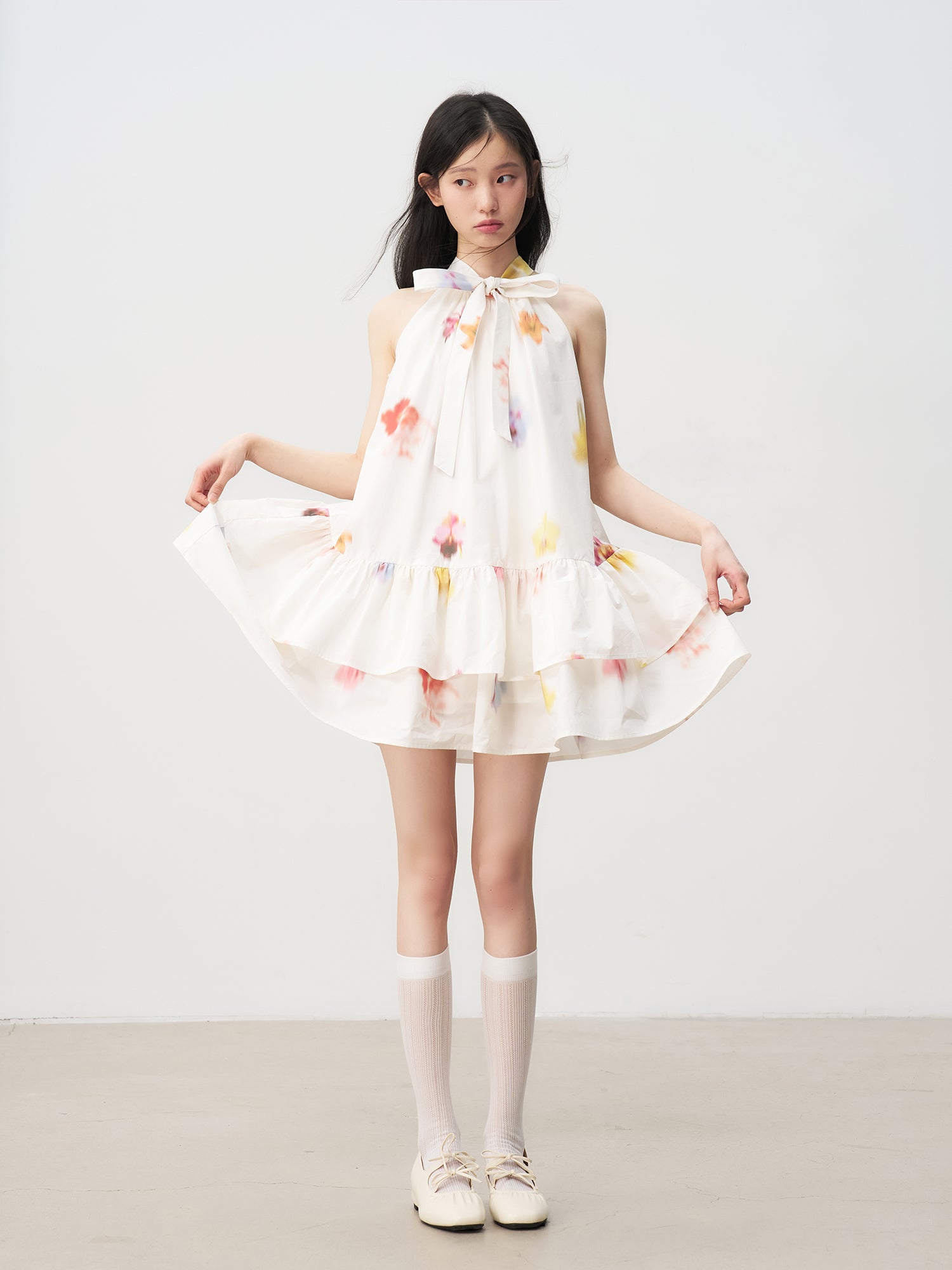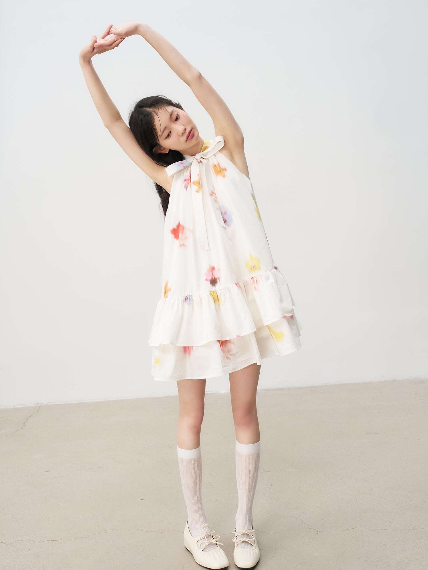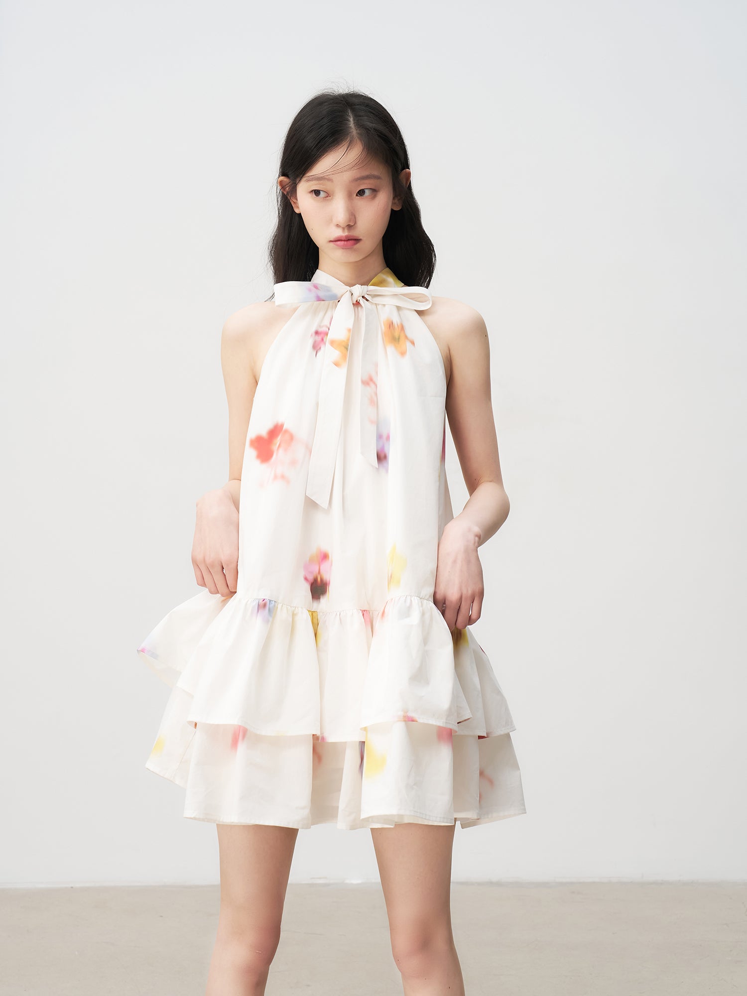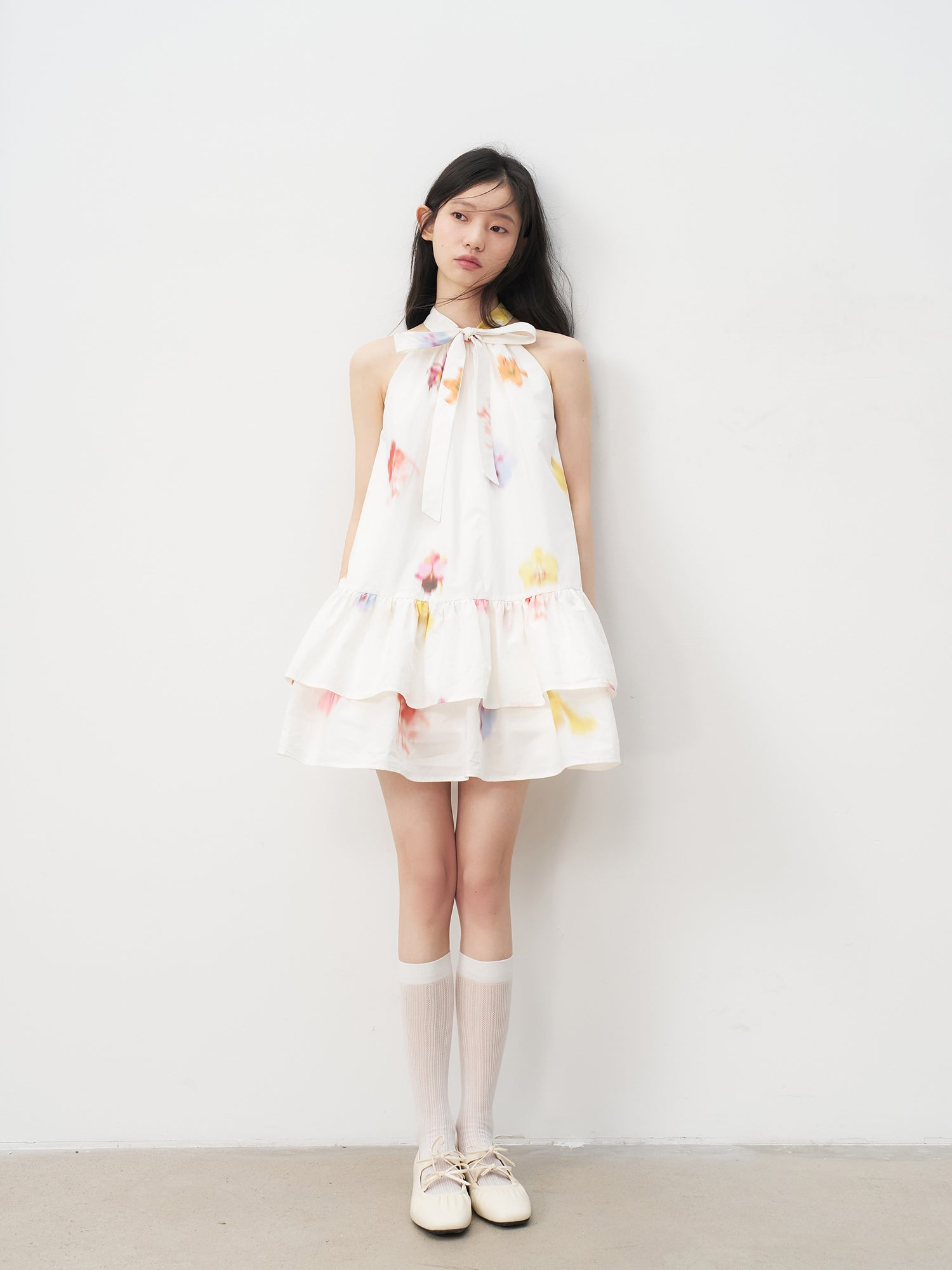 Sleeveless Floral Bow Tie Halter Dress with Ruffled Hem Tutu Skirt R5169