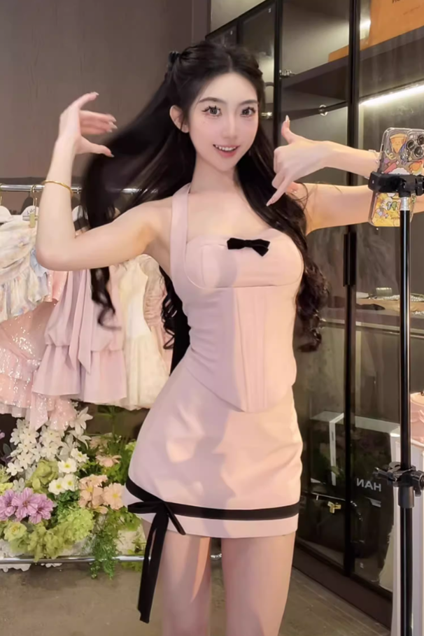 Sweet and spicy design bow halter neck short top 2025 pure desire style hip skirt suit R1095