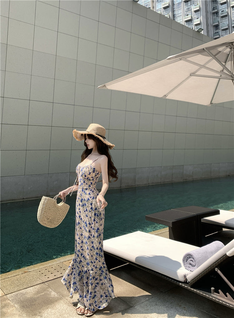 Tea break floral suspender dress gentle temperament waist slim fit A-line skirt R0499