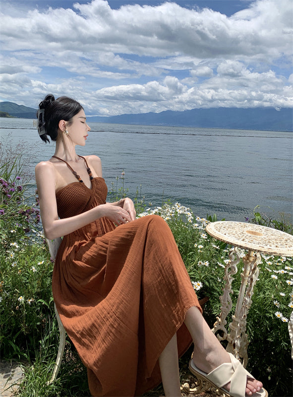 Travel wear retro beaded halter neck knitted dress seaside holiday beach dress R1593
