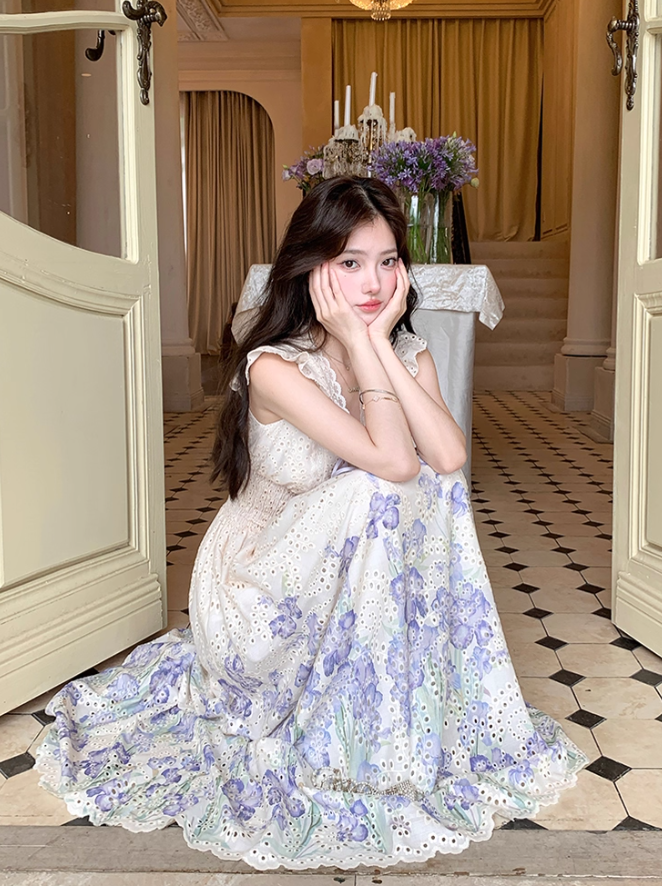 V-neck small flying sleeves printed hollow waist dress women's summer French temperament skirt R4618