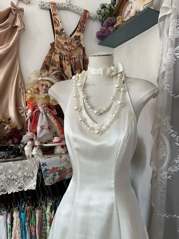 White halter neck satin waist slim fit A-line temperament sexy long skirt ball gown R6194