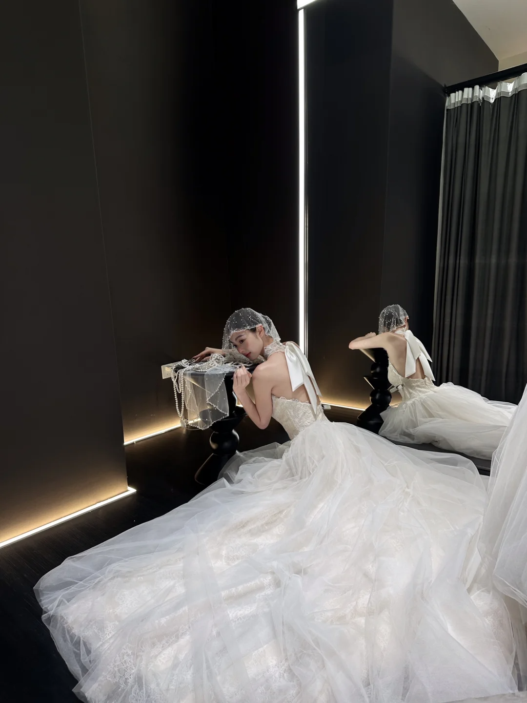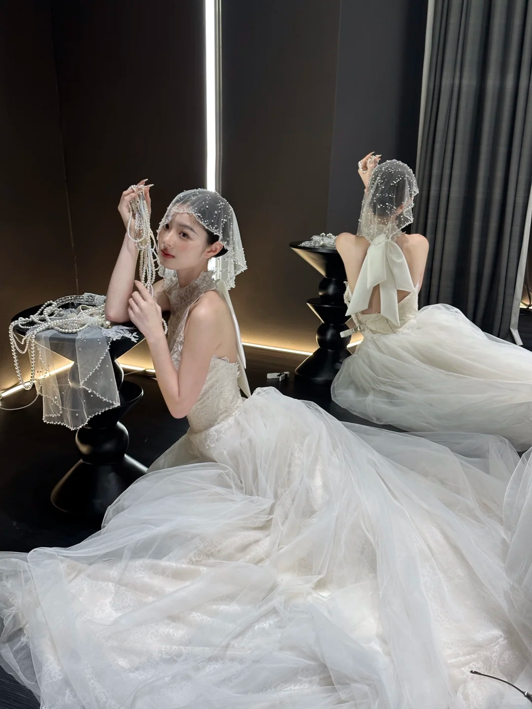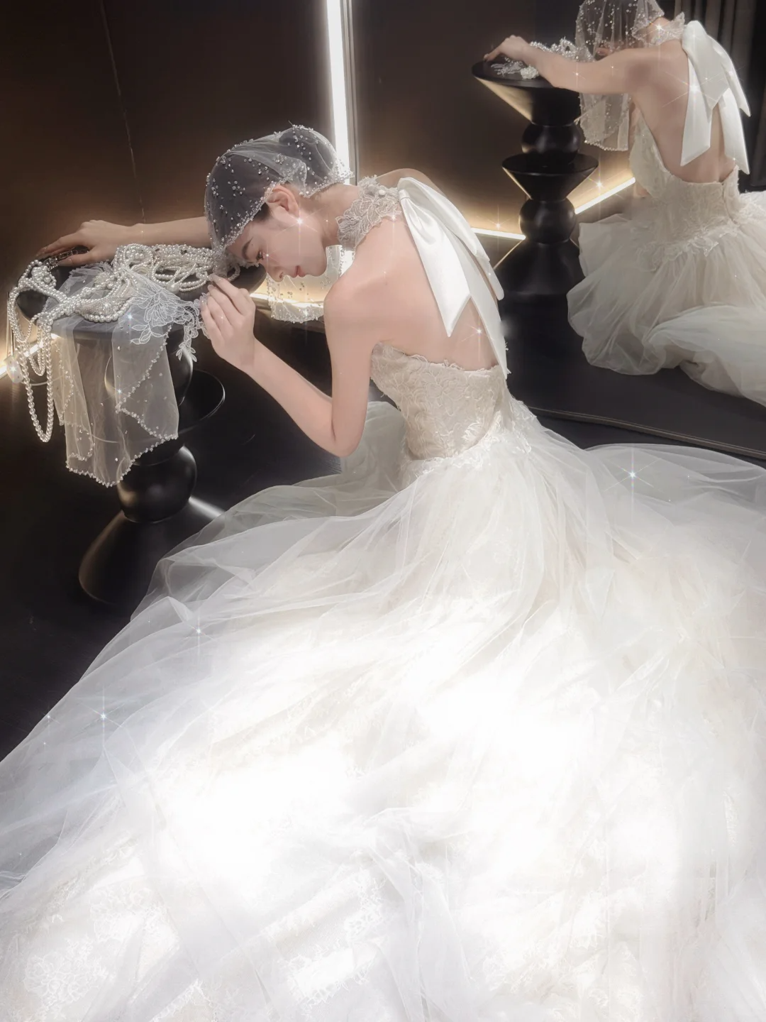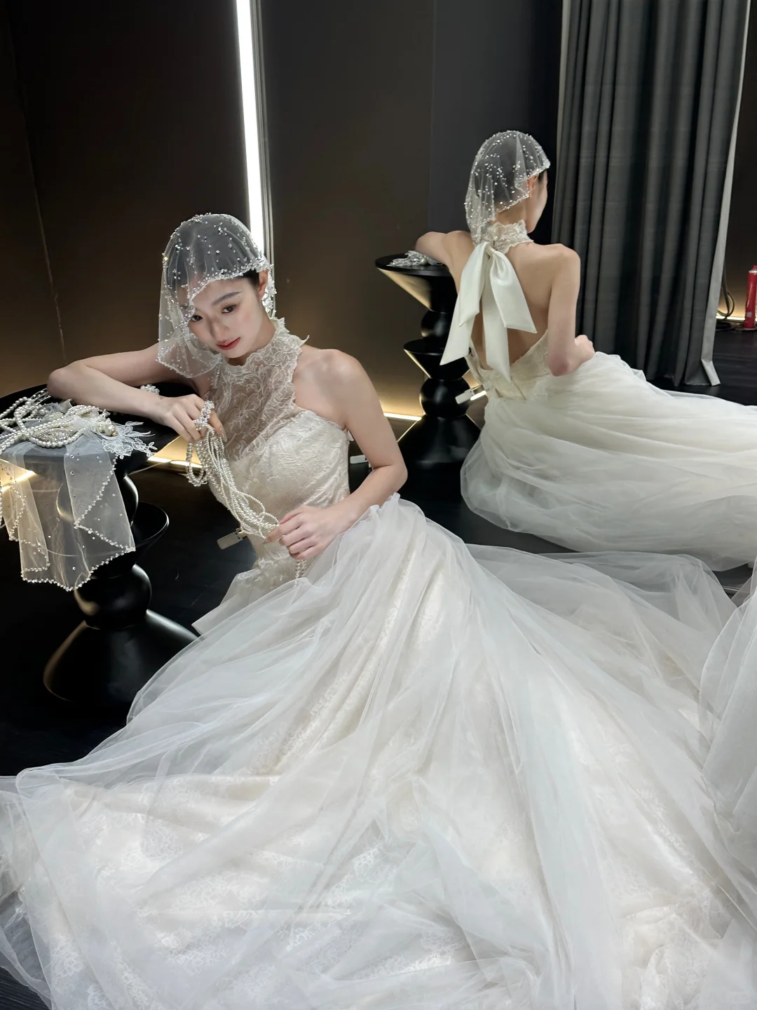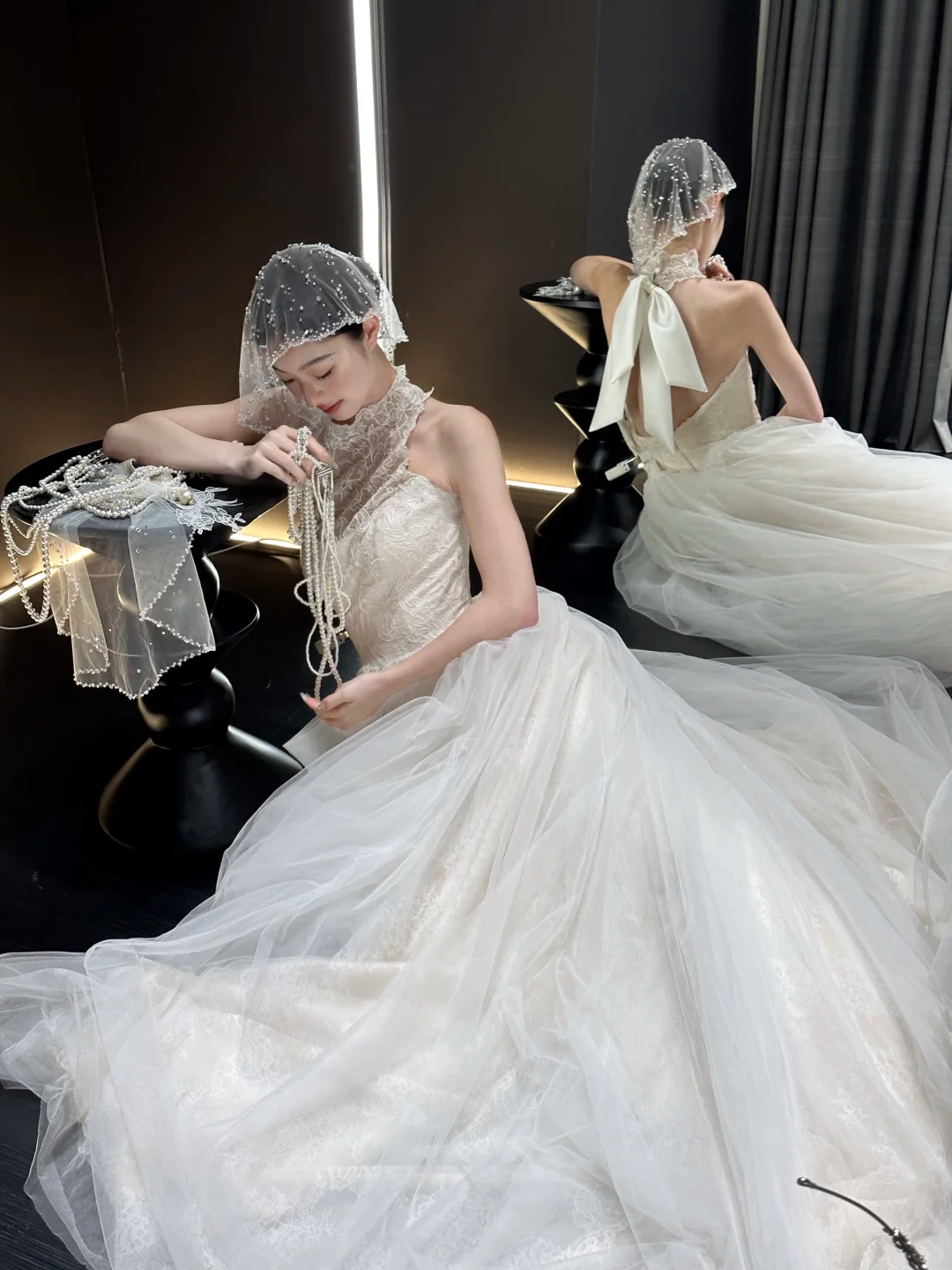 White lace elegant halter neck slim waist long dress bridal gown R6049