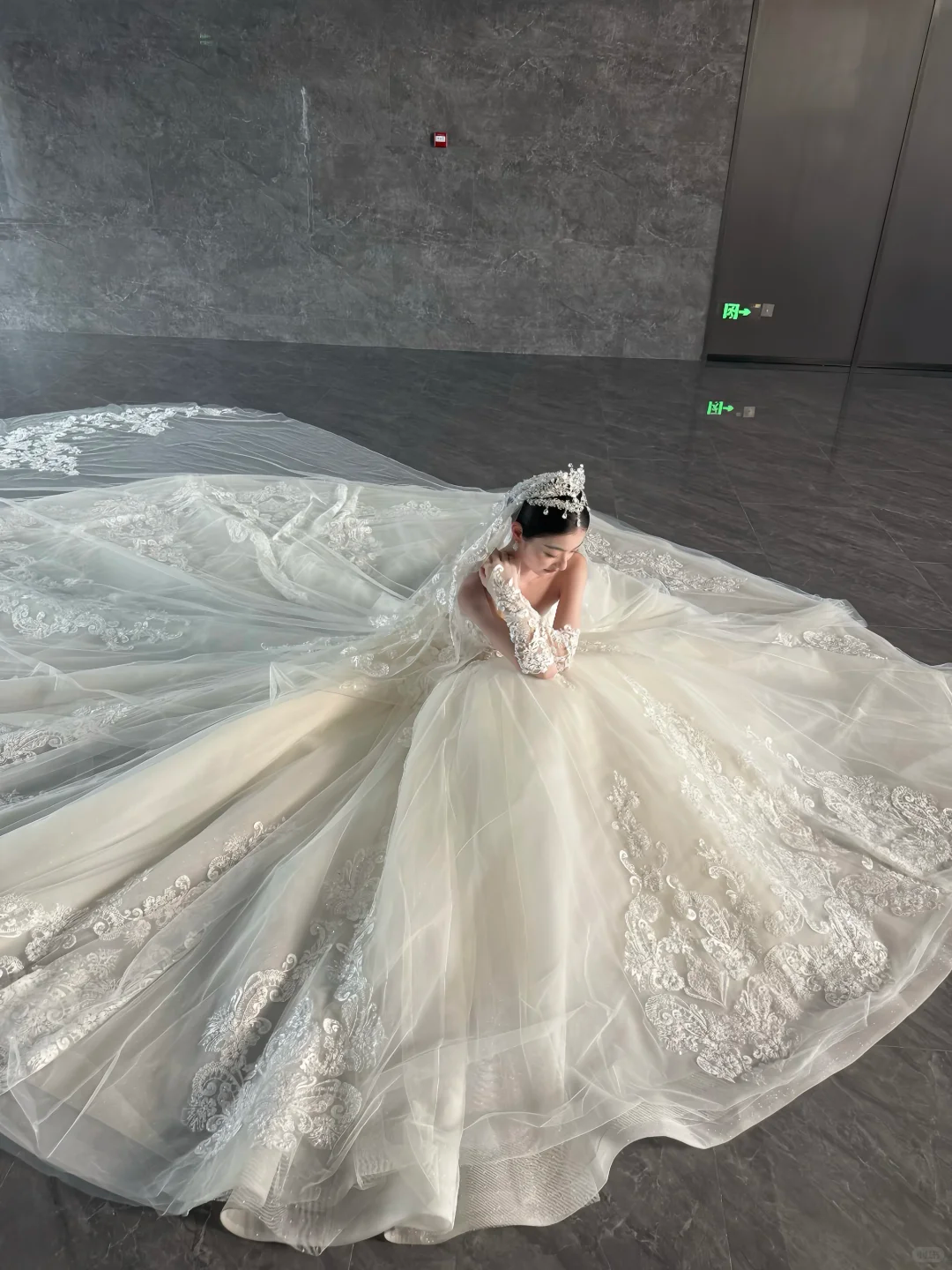 White strapless lace waist slim fit puffy skirt floor-length bridal gown R6045