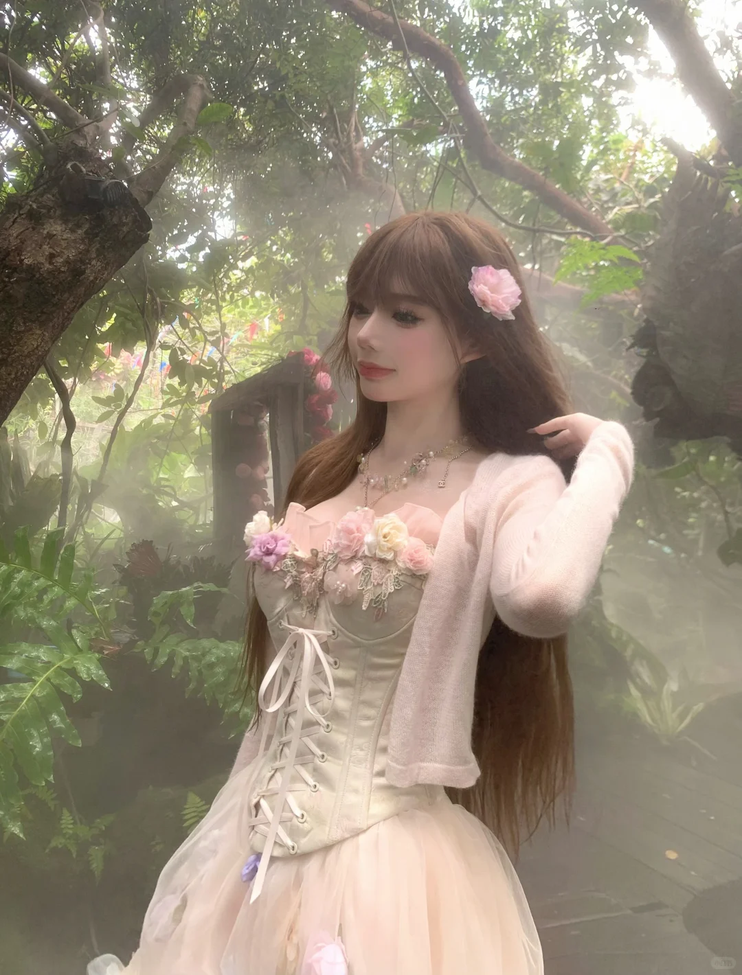 White tube top pink three-dimensional flower fishbone waist slim fit puffy tulle skirt homecoming dress R4234