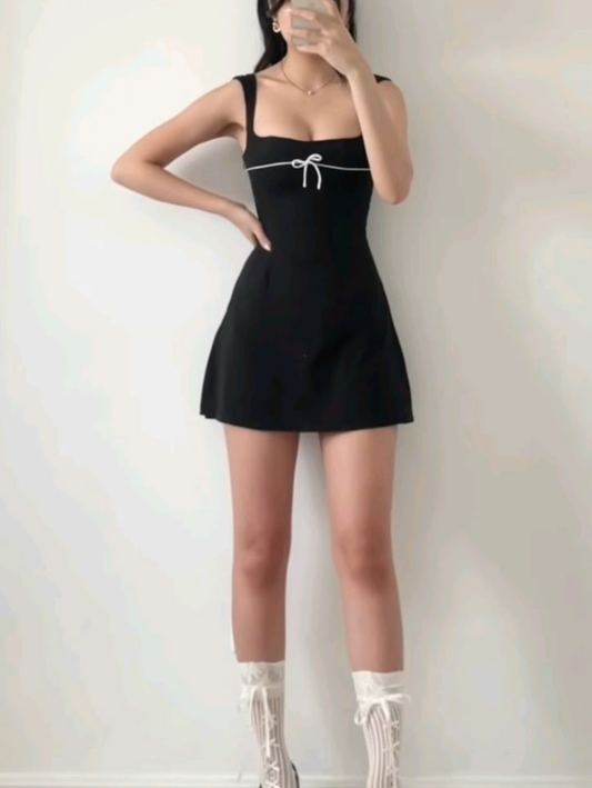Black suspenders waist slim A-line short skirt homecoming dress R3156