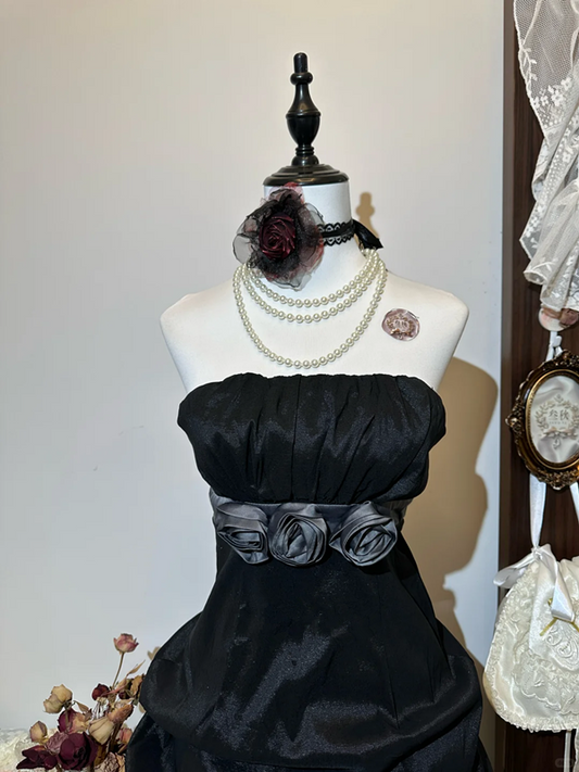 Black tube top waist high-end elegant three-dimensional flower skirt temperament short skirt homecoming dress R4694