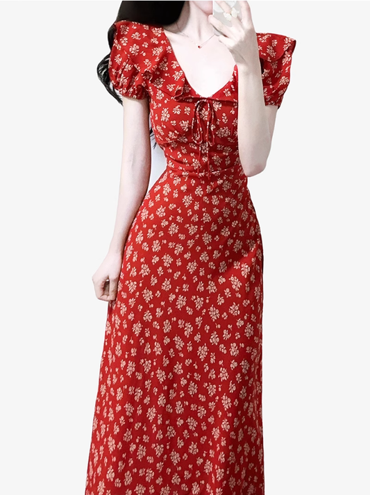2025 Summer New Red Floral Tea Break Ruffled V-Neck French Waist Dress R0918