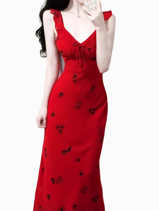2025 Summer New Red Floral Sexy V-neck Mid-length Holiday Suspender Dress R0919