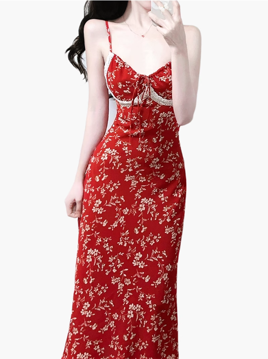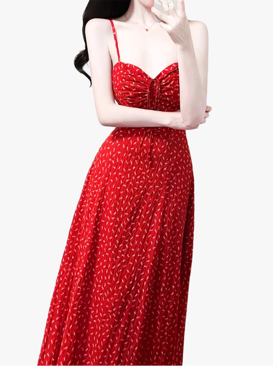 2025 summer new red floral temperament slim medium-length suspender dress R0924