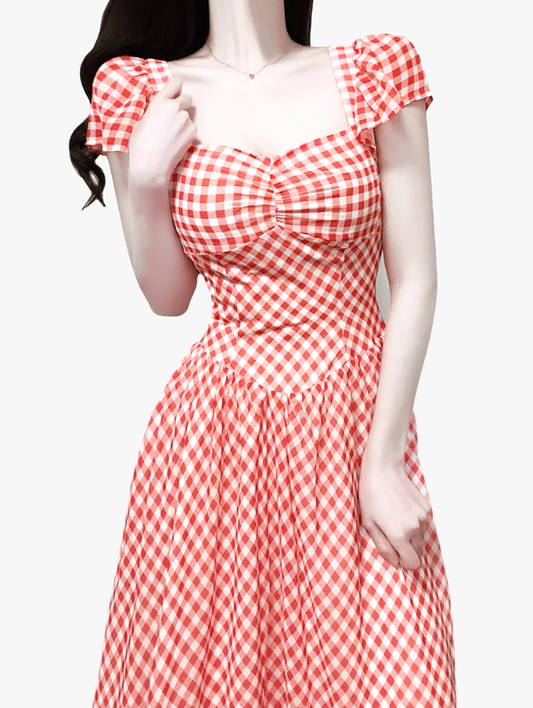 2025 Summer New Red Plaid Square Neck French Short Sleeve High Waist Long Dress R0943