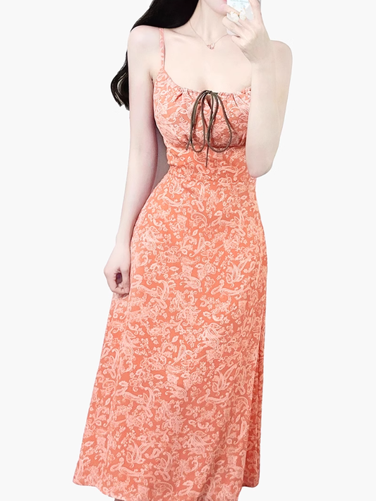 2025 Summer New Retro Cashew Printed Backless French Long Suspender Dress R0967