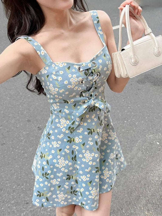 Blue fresh daisy floral suspenders waist slim short skirt homecoming dress R3258