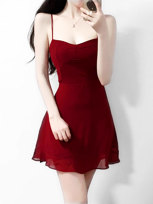 2025 summer new sexy petite wine red holiday short suspender dress R0916