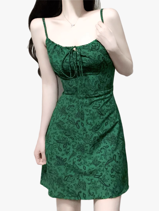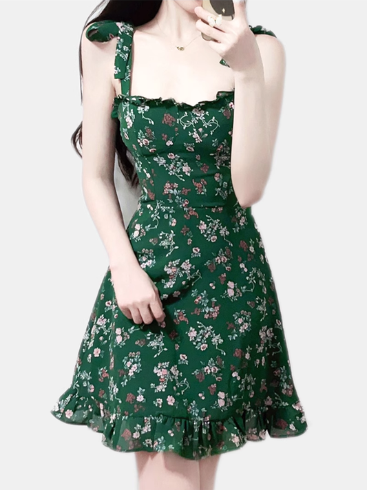 2025 Summer New Retro Sexy Floral Green A-line Short Suspender Dress R0934
