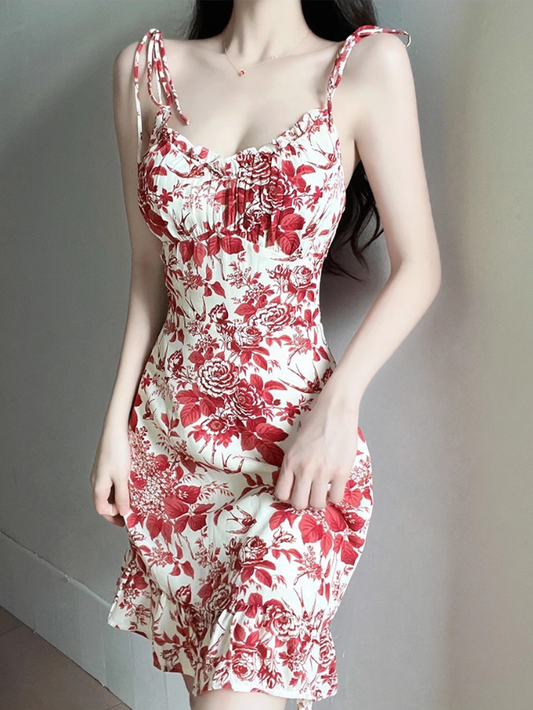 2025 Summer New Romantic Red Floral Waist Tie Holiday Suspender Dress R0922