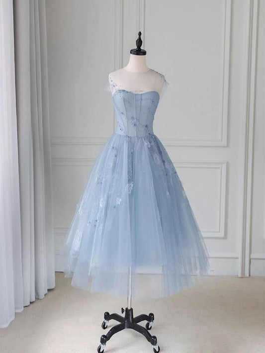 blue round neck tulle short prom dress, blue tulle homecoming dress S3242