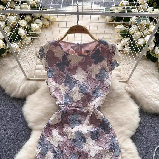 Butterfly floral lace-up halter neck dress gentle style temperament long skirt R0754