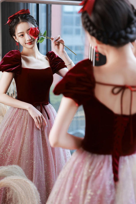 Burgundy Velvet Cap Sleeves Tulle Long Princess Dress S3008