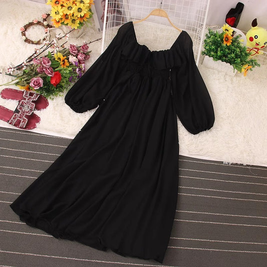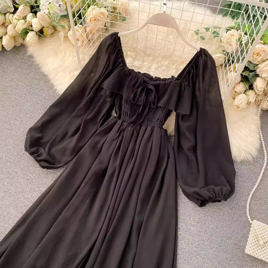 Chic Style Dress New Women's Square Neck Puff Sleeve Chiffon Skirt S4597