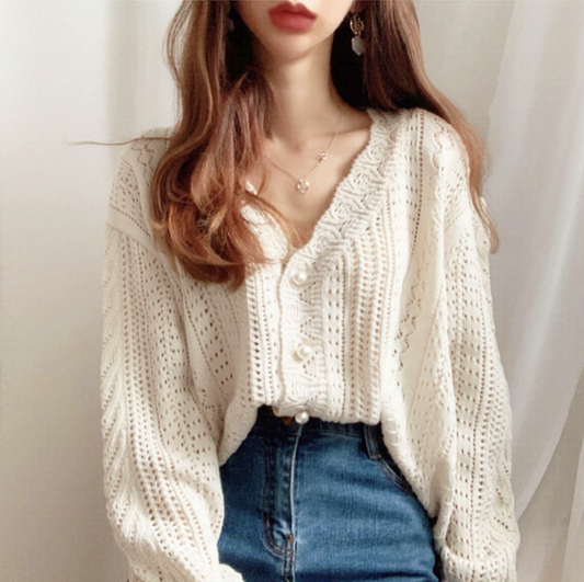 Chic V-neck Crochet Lace Hollow out Knit Cardigan Sweater S2790